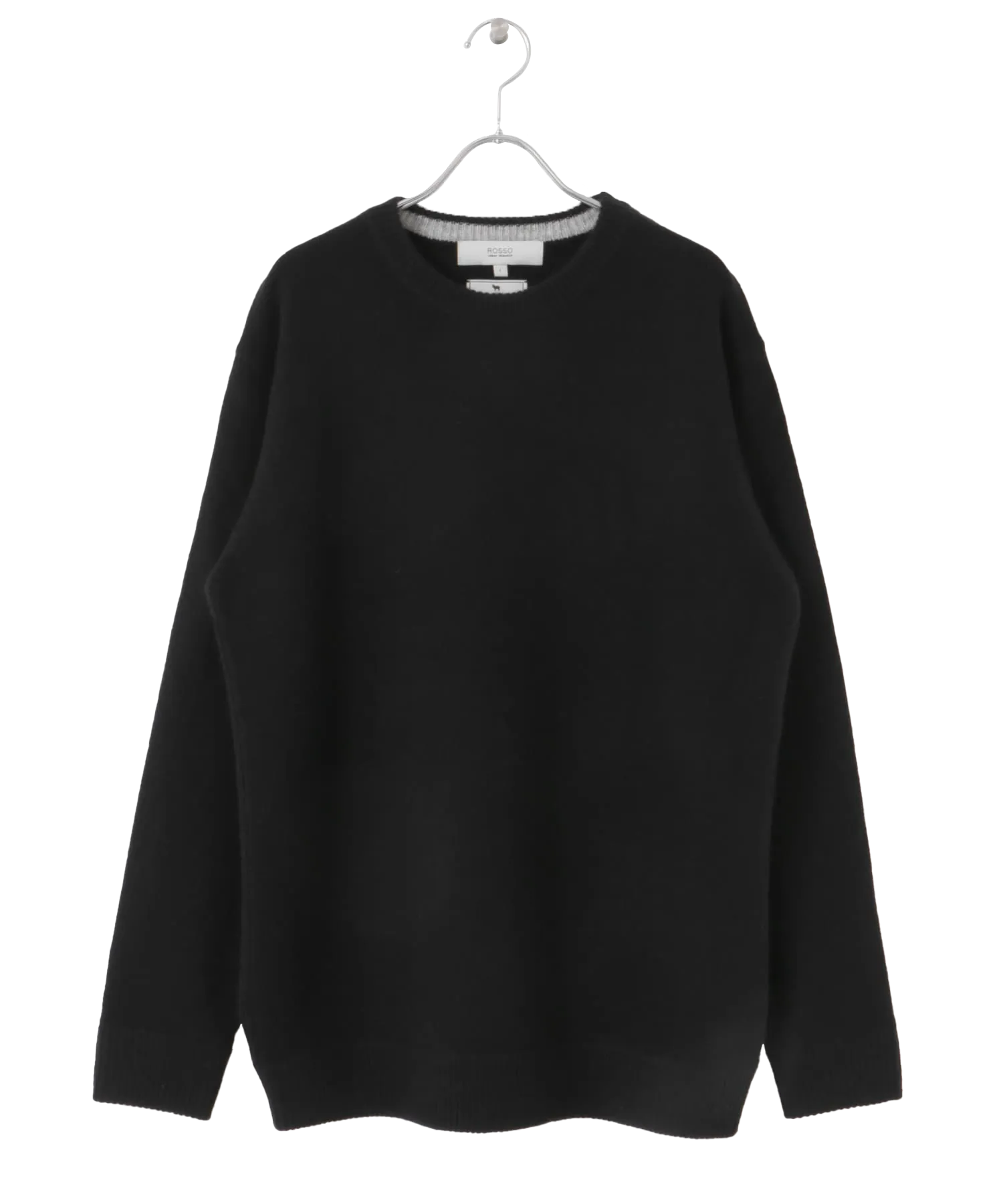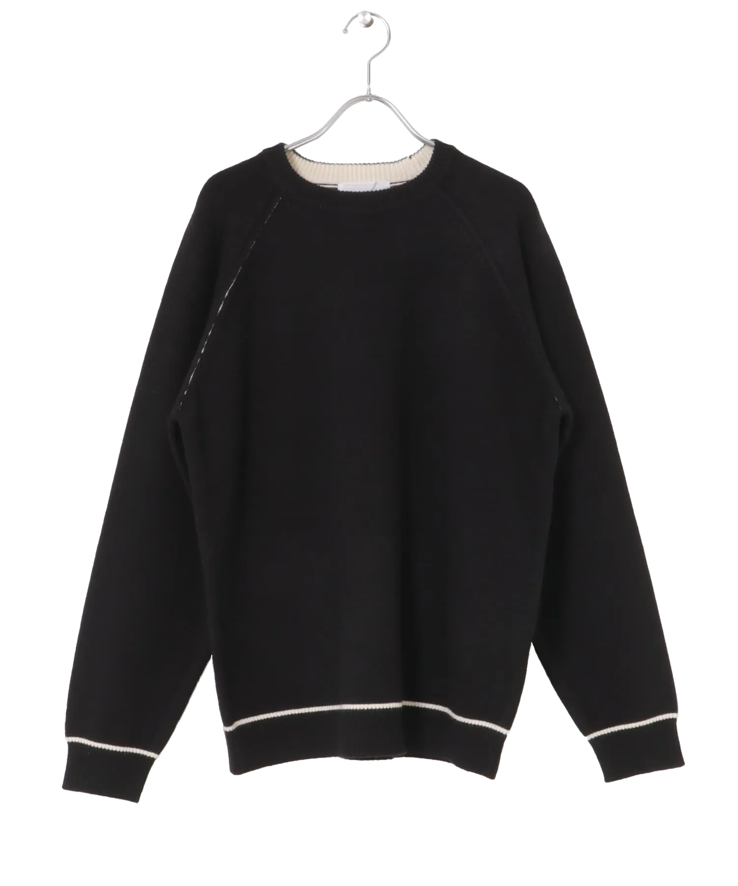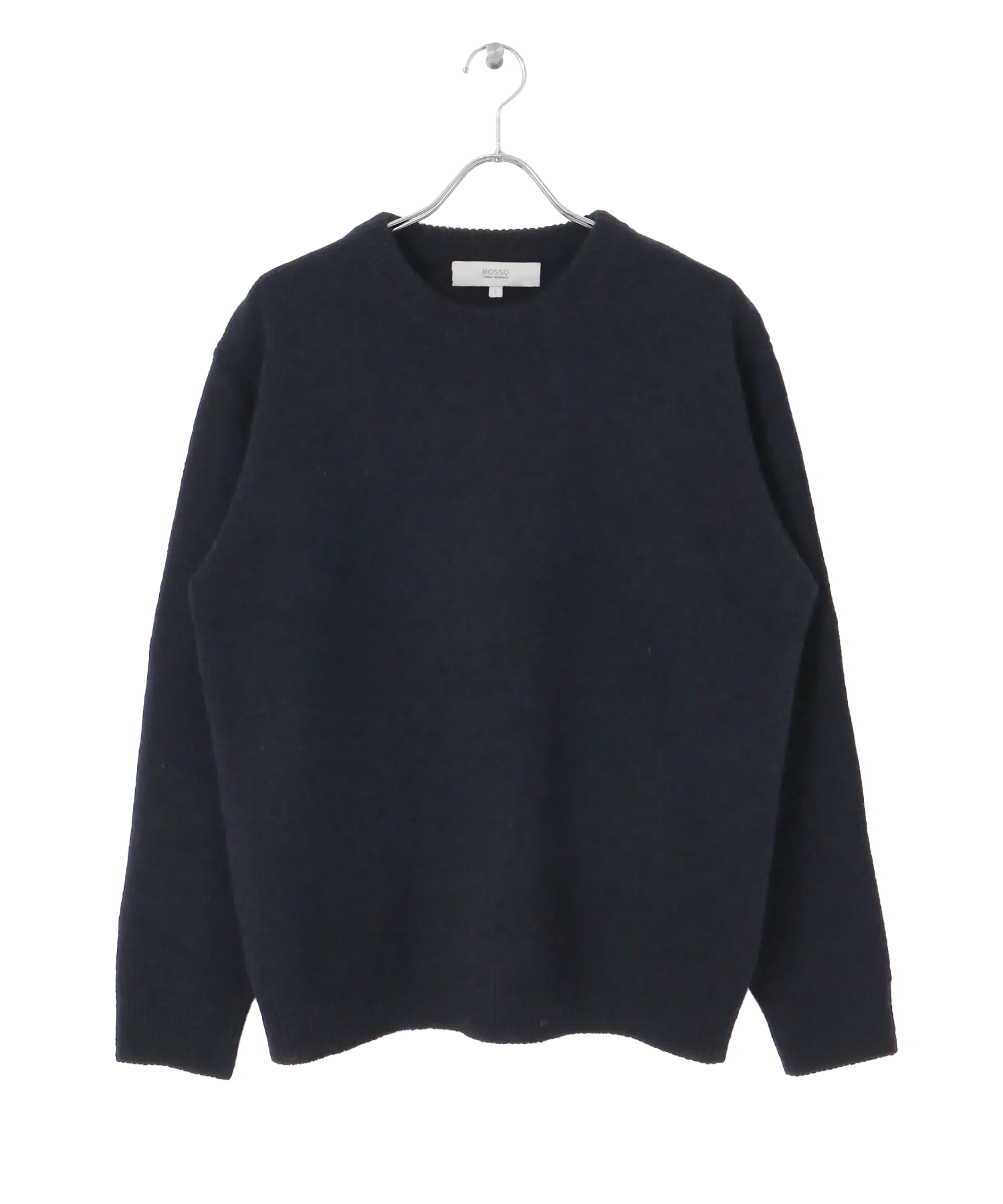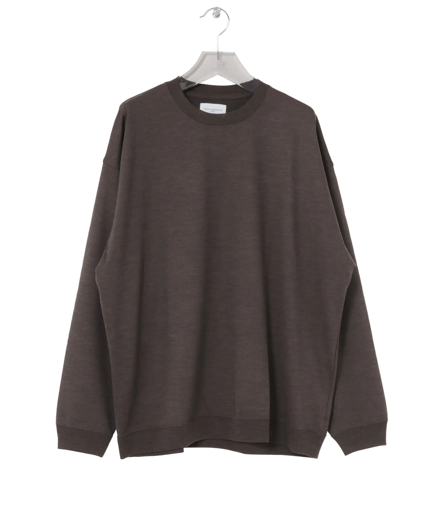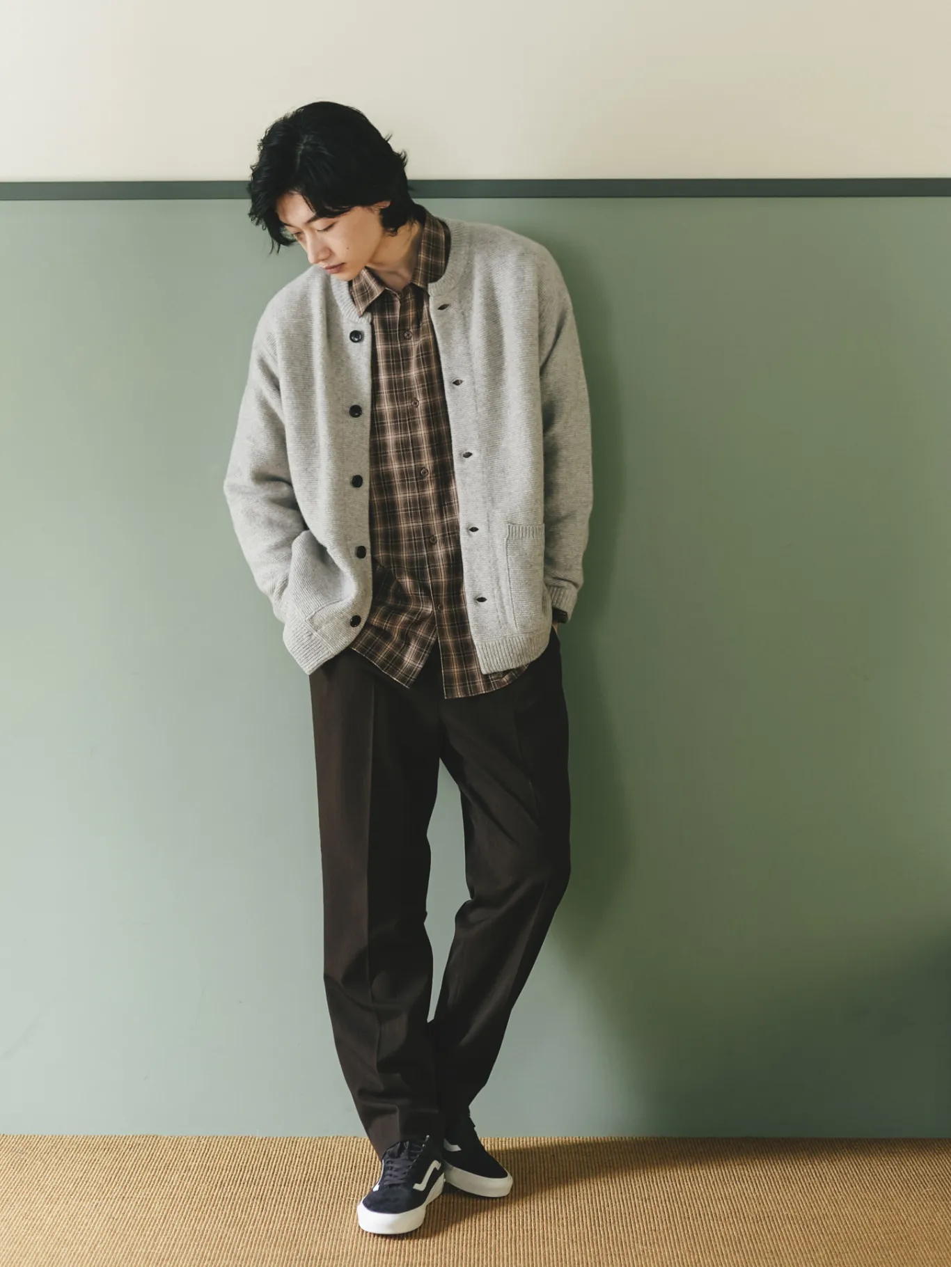 crepusculeに別注した特別感のあるニット。インラインにはない型と色をゼロから採用し、3色の撚り杢生地で独特の風合いに仕上げました。ネックラインを浅めに設定することで、上品さと着回しの良さを両立しています。
