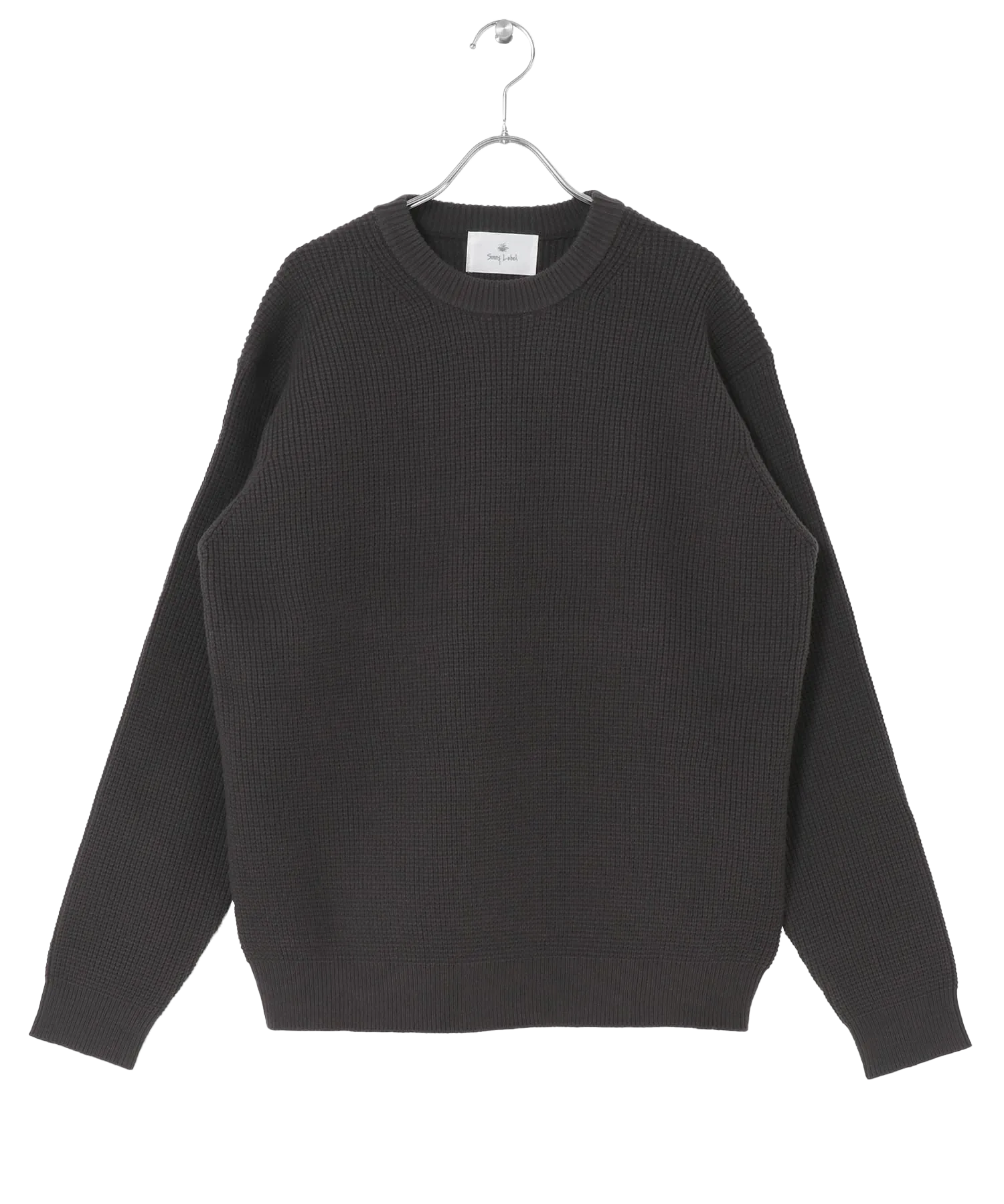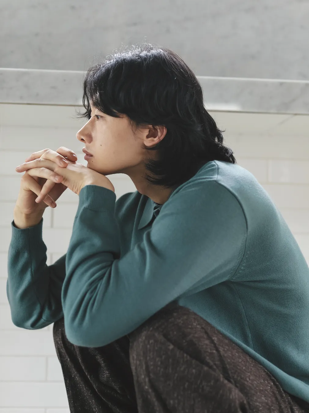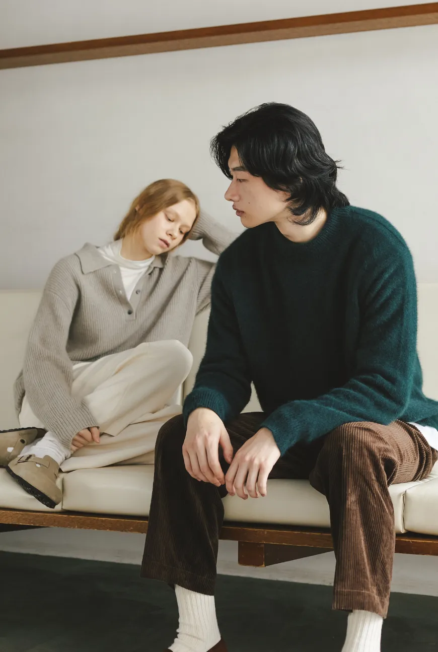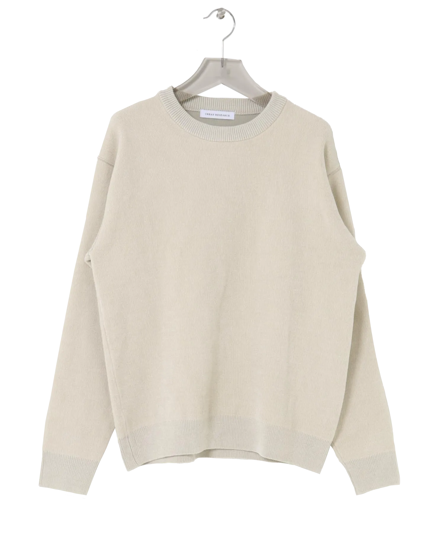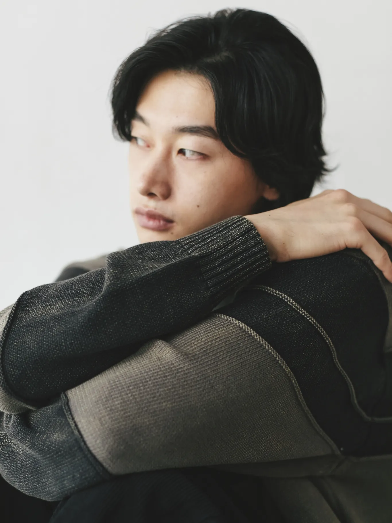 crepusculeに別注した特別感のあるニット。インラインにはない型と色をゼロから採用し、3色の撚り杢生地で独特の風合いに仕上げました。ネックラインを浅めに設定することで、上品さと着回しの良さを両立しています。