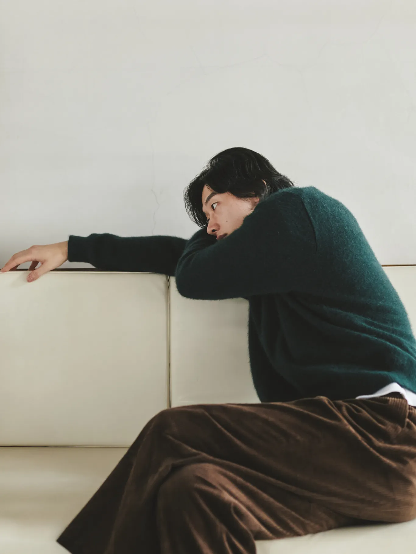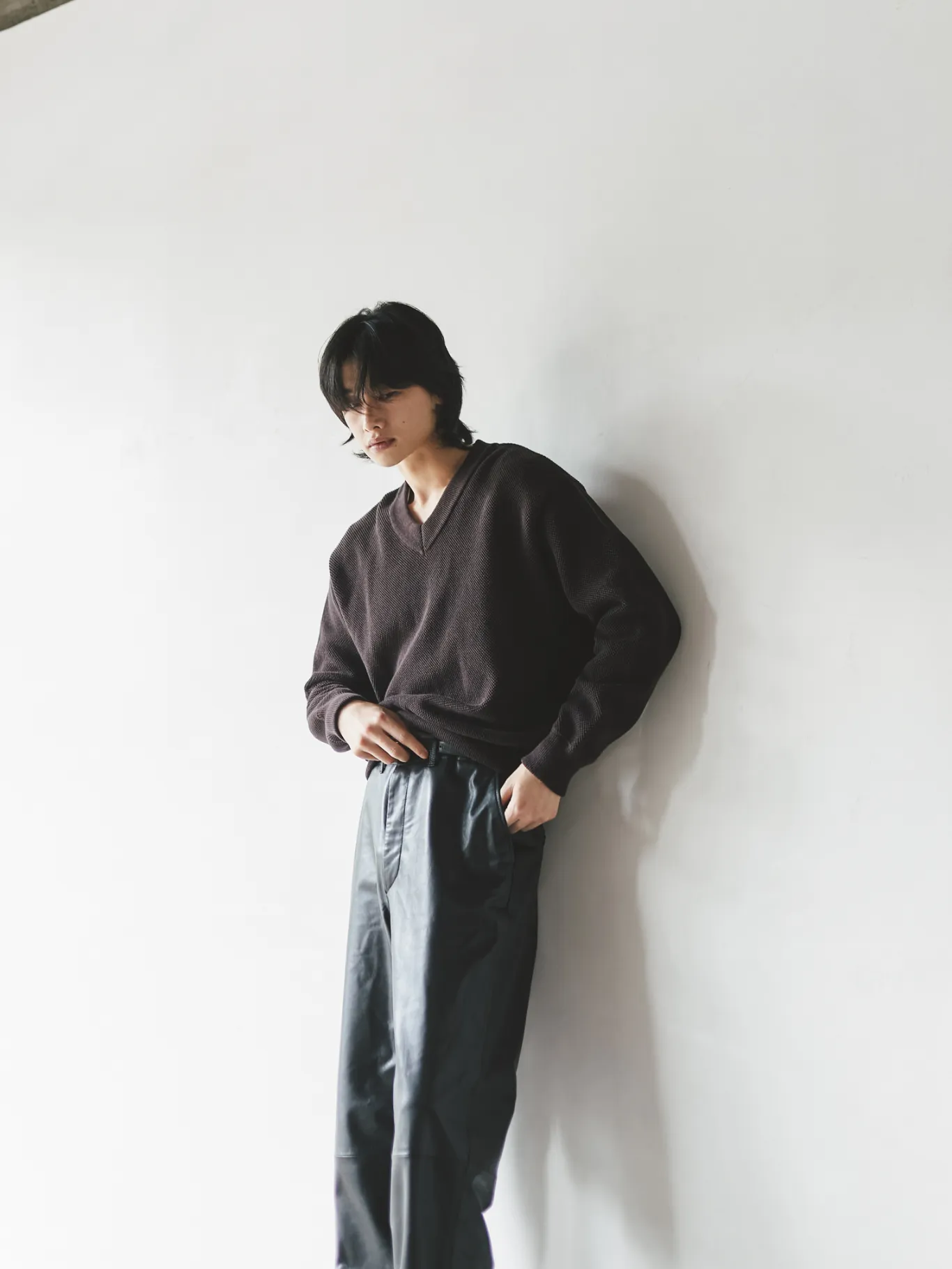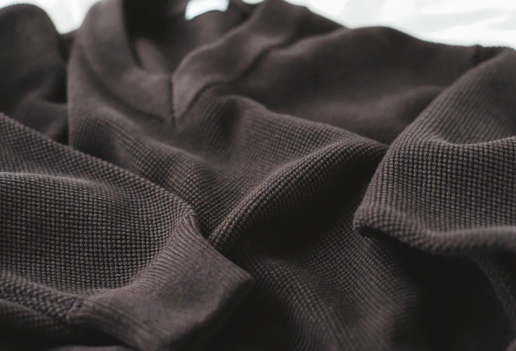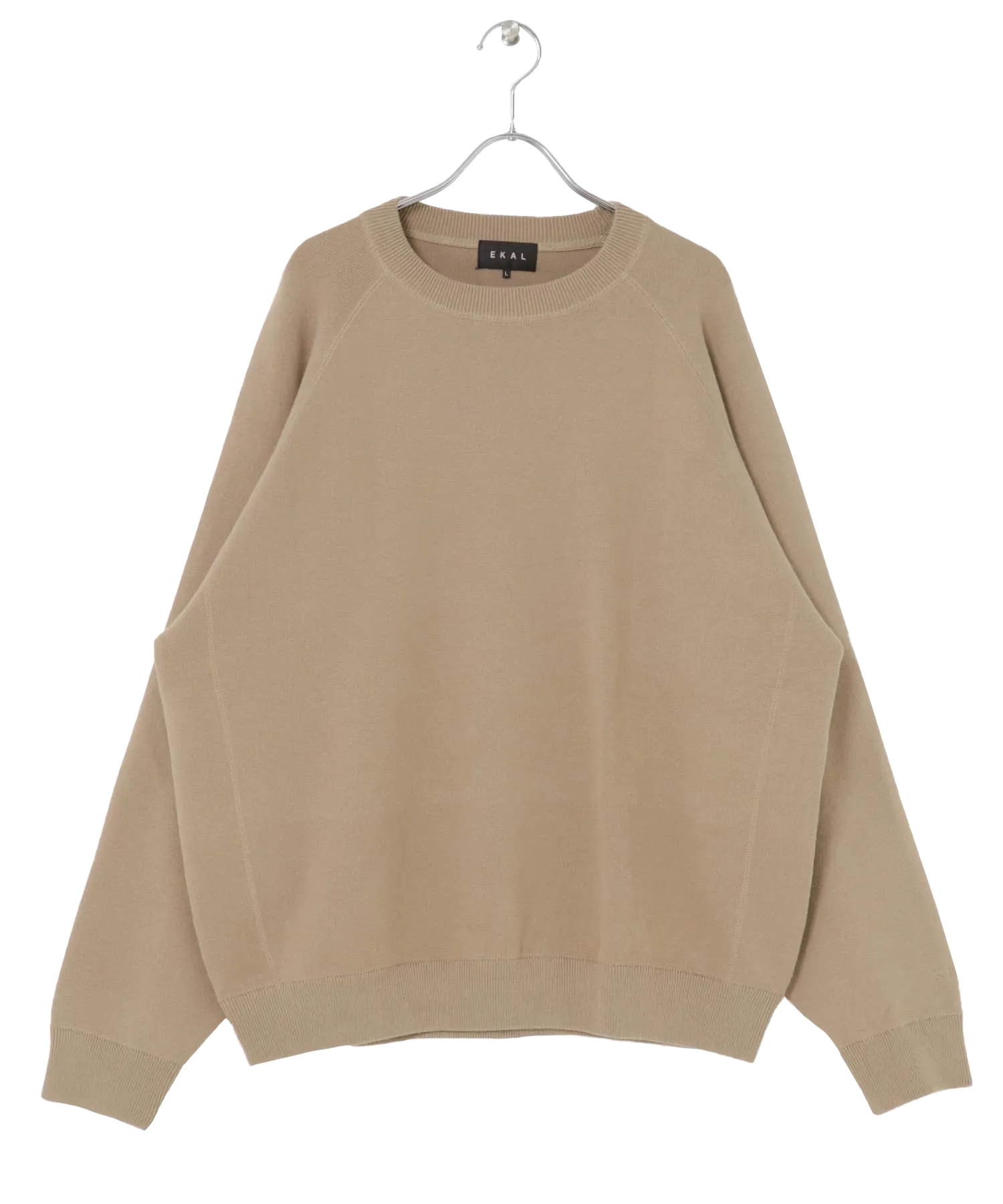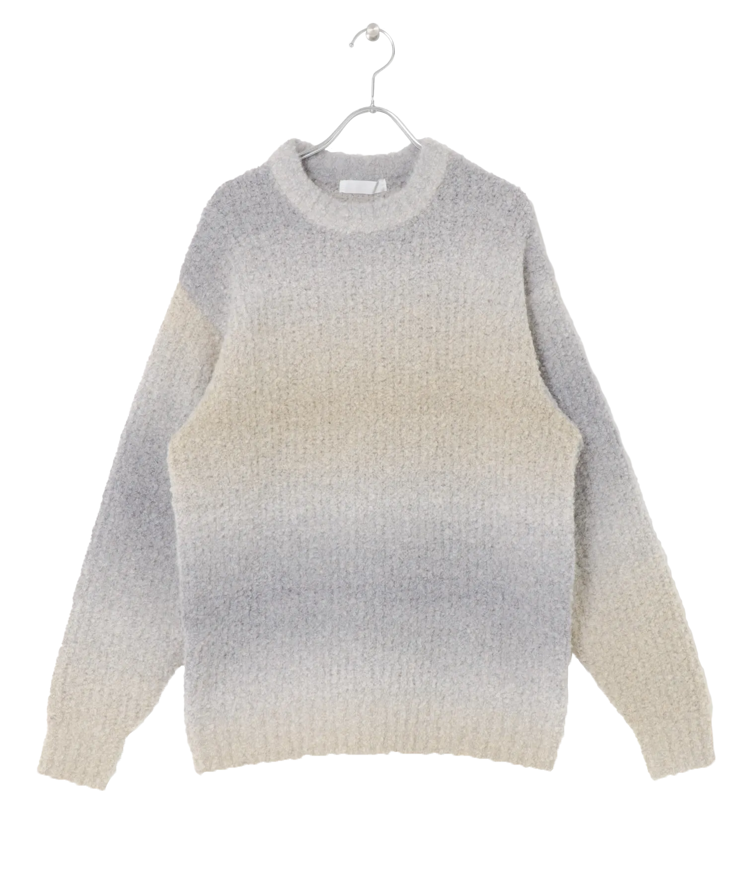 crepusculeに別注した特別感のあるニット。インラインにはない型と色をゼロから採用し、3色の撚り杢生地で独特の風合いに仕上げました。ネックラインを浅めに設定することで、上品さと着回しの良さを両立しています。