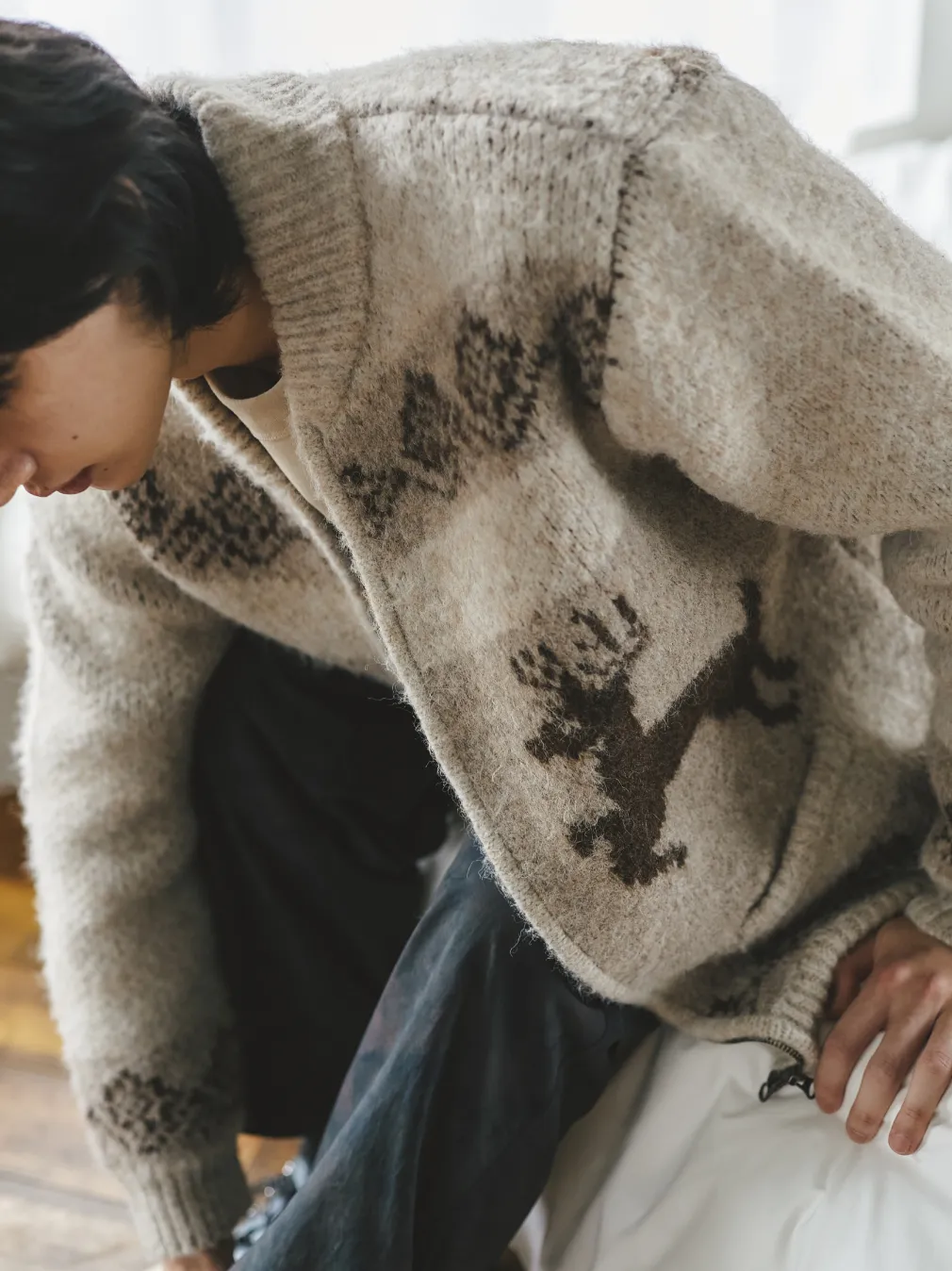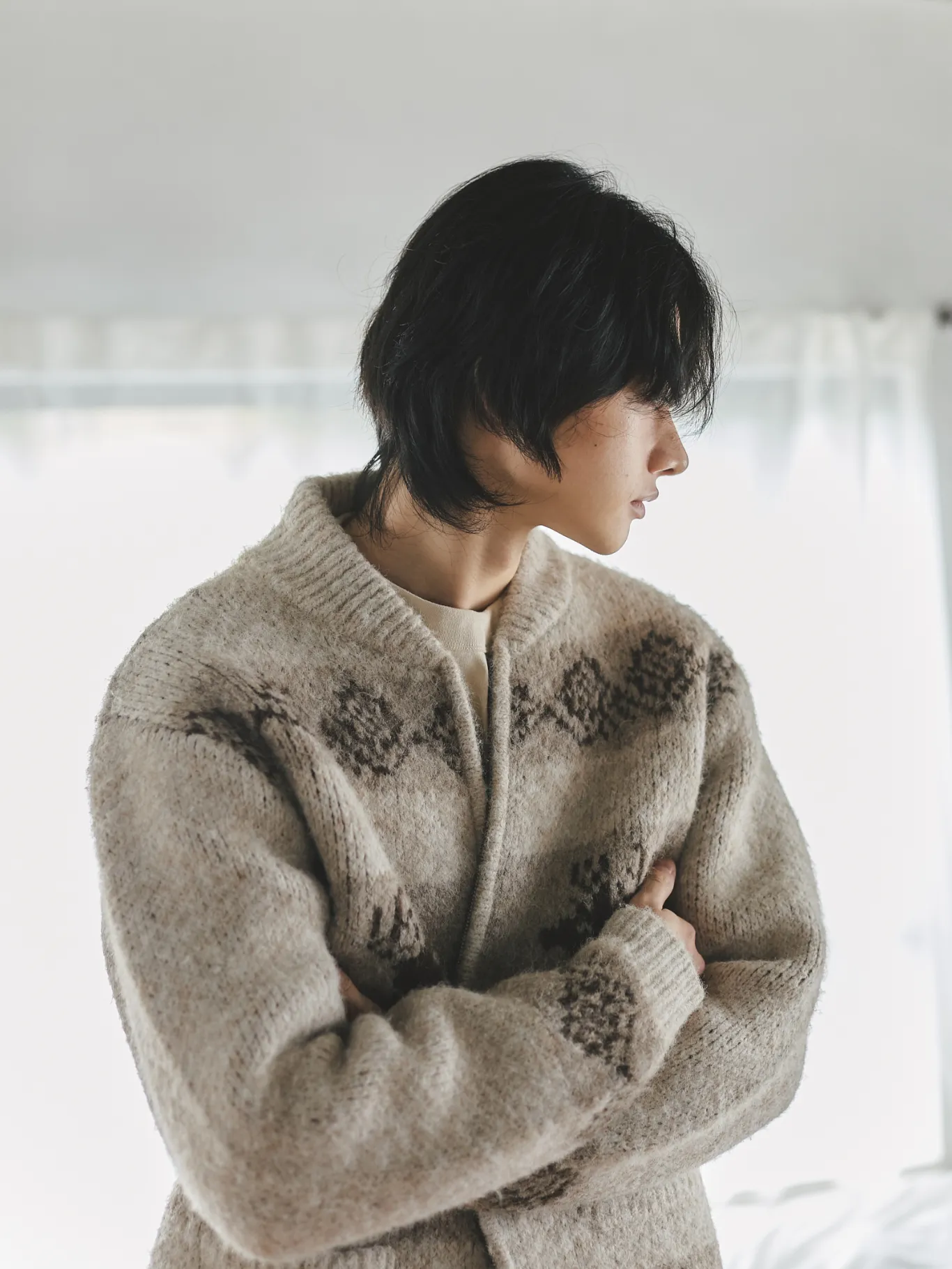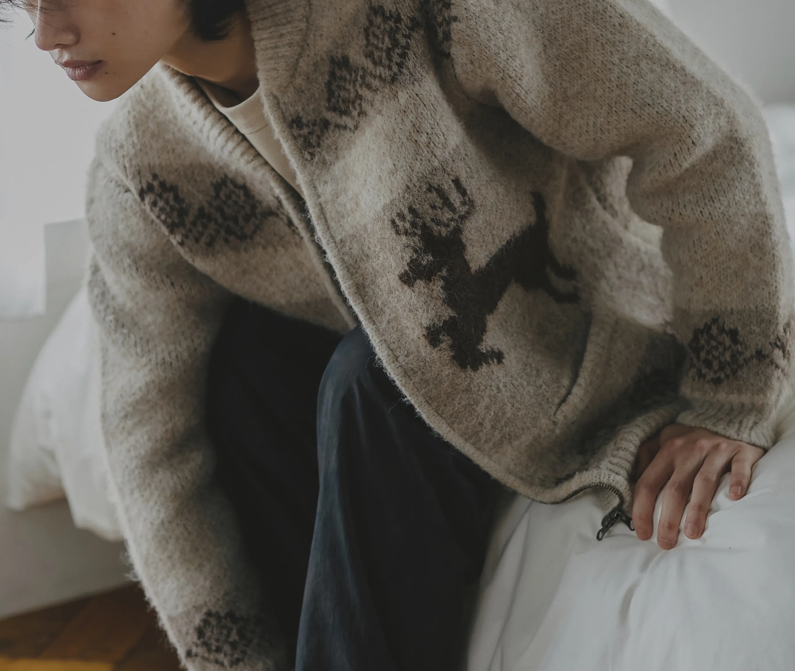 毛足のある糸とリサイクルポリエステルを用いたカウチンニット。ふんわりとしたバルキー性の高いダブルジャガード編みを採用しながら、すっきりと着こなせるスタンドカラーが特徴。編みこまれたモチーフが、取り入れるだけで冬のムードを格上げします。