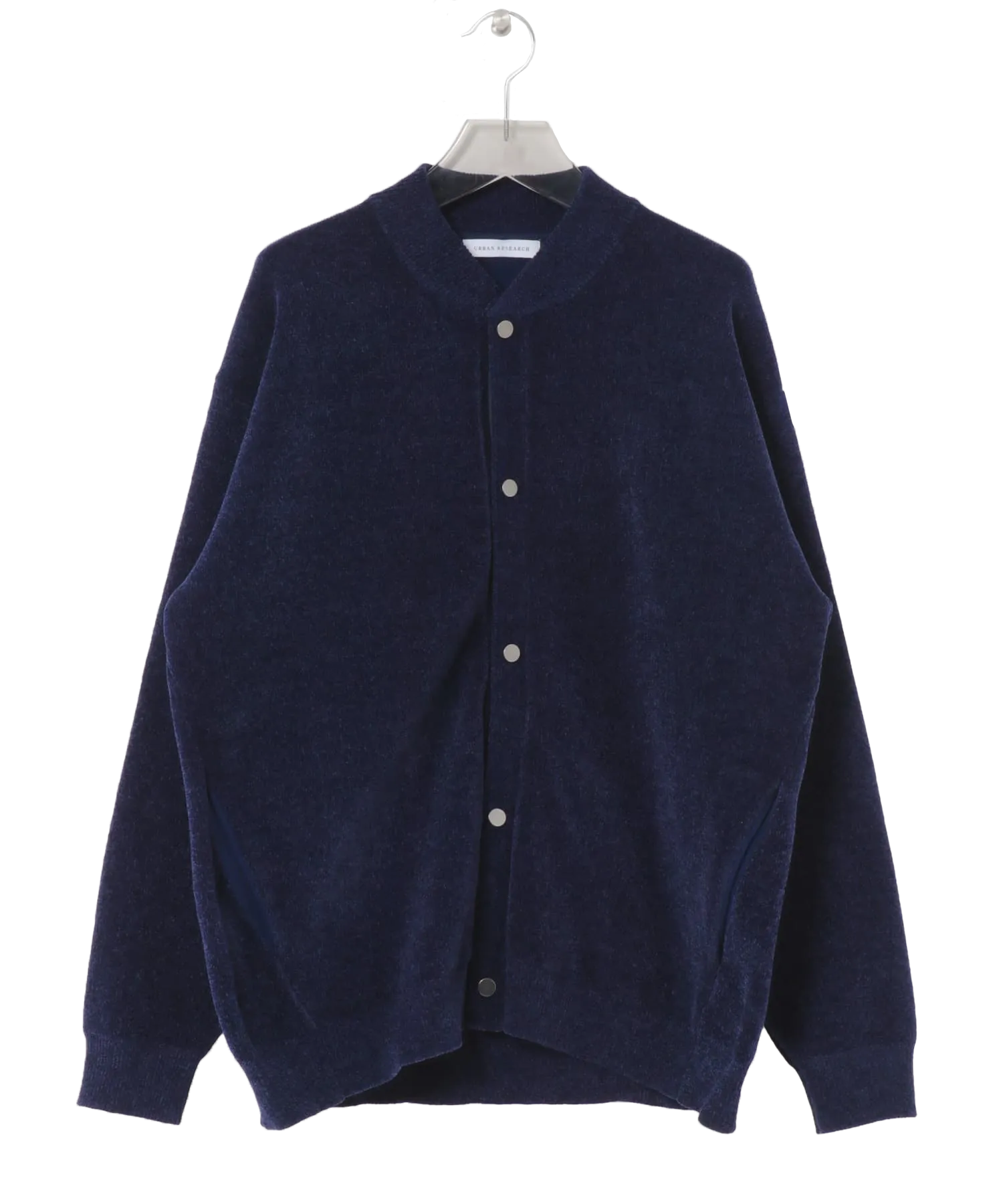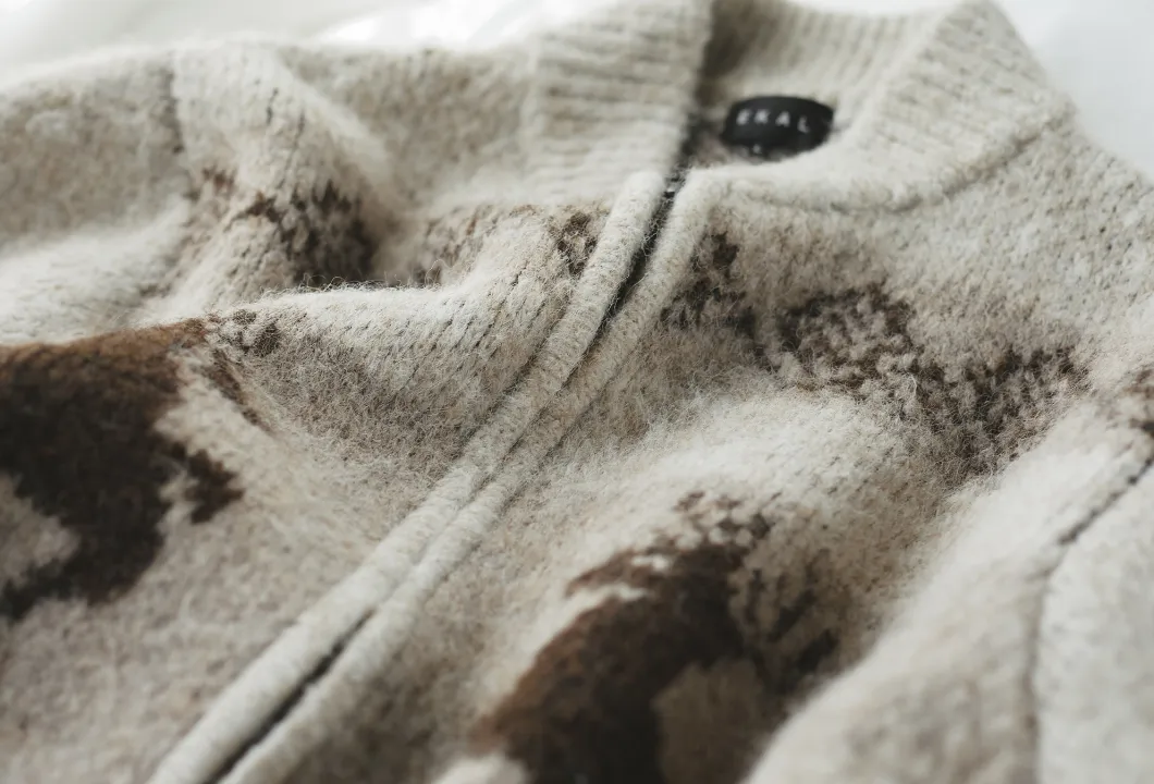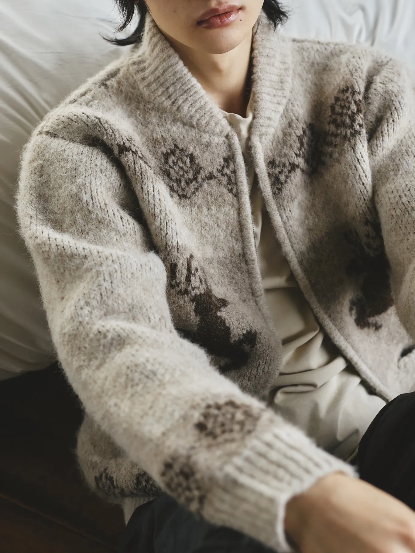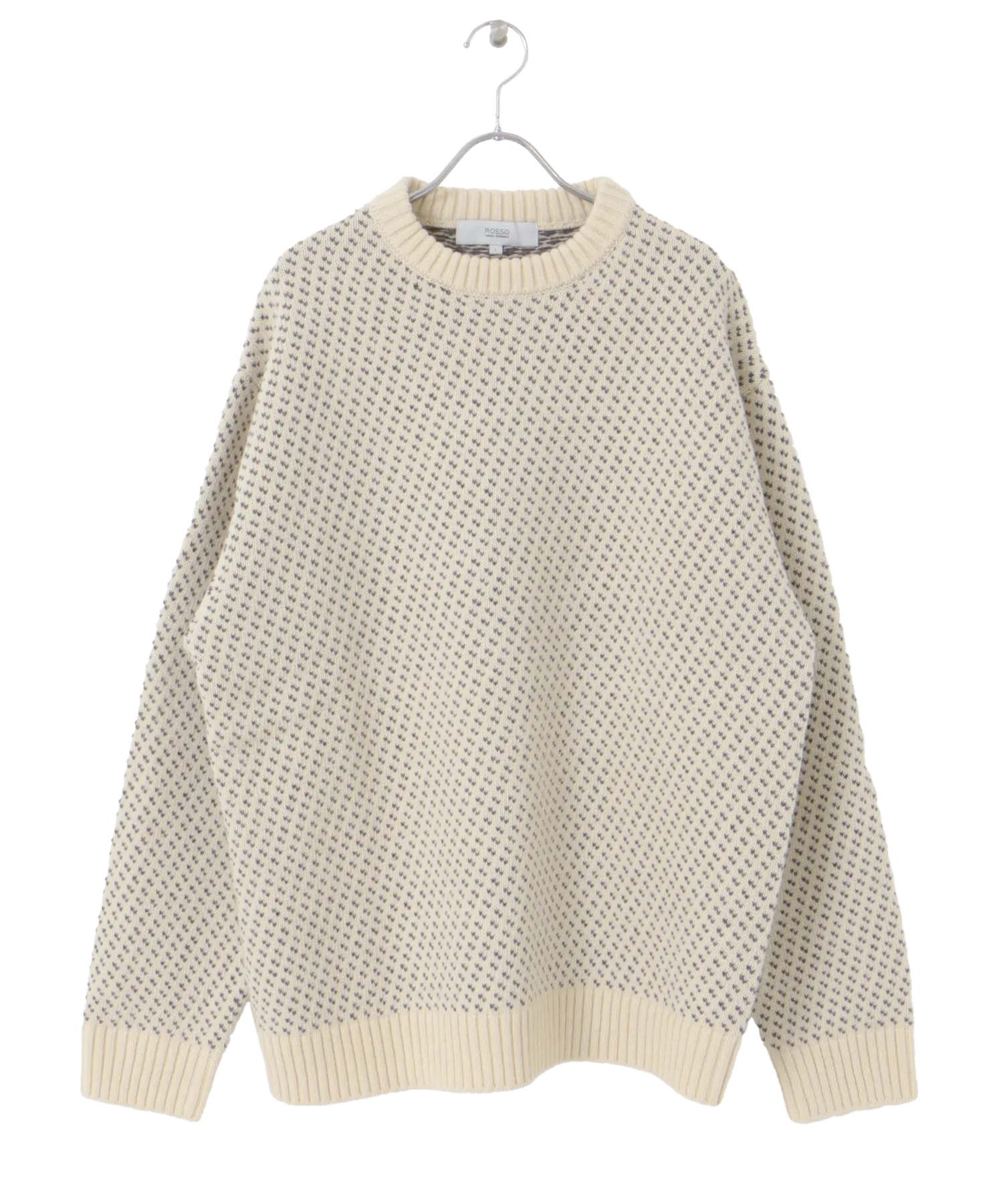 毛足のある糸とリサイクルポリエステルを用いたカウチンニット。ふんわりとしたバルキー性の高いダブルジャガード編みを採用しながら、すっきりと着こなせるスタンドカラーが特徴。編みこまれたモチーフが、取り入れるだけで冬のムードを格上げします。