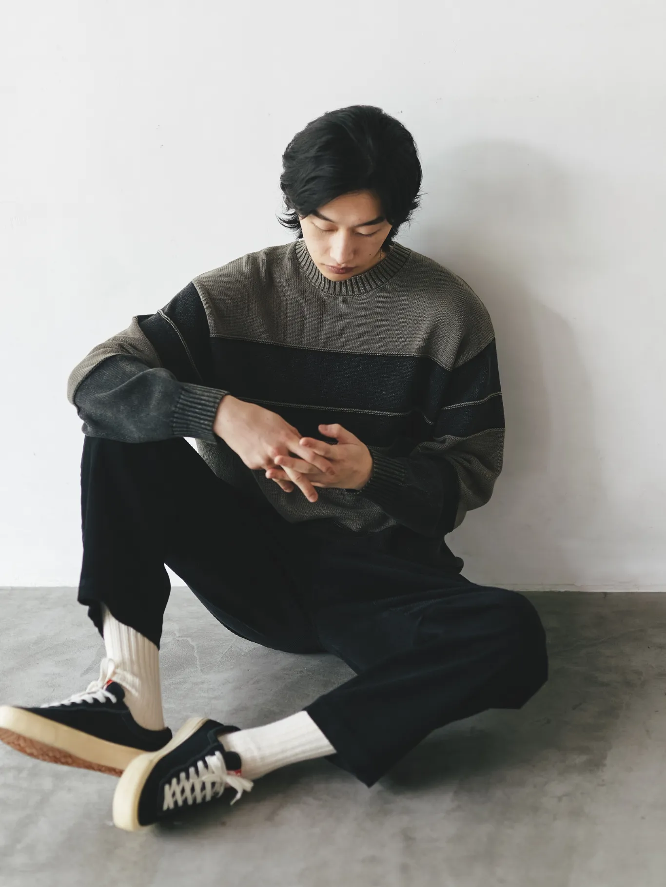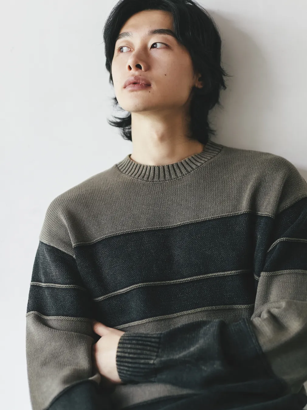 普通になりがちなボーダーニットを、ヴィンテージライクなピグメント加工とパネル切り替えで鮮度を出しました。程よい肉感で暖かくも着ぶくれしない計算された設計。肩の力を抜いたシルエットは着こなしの幅を広げます。