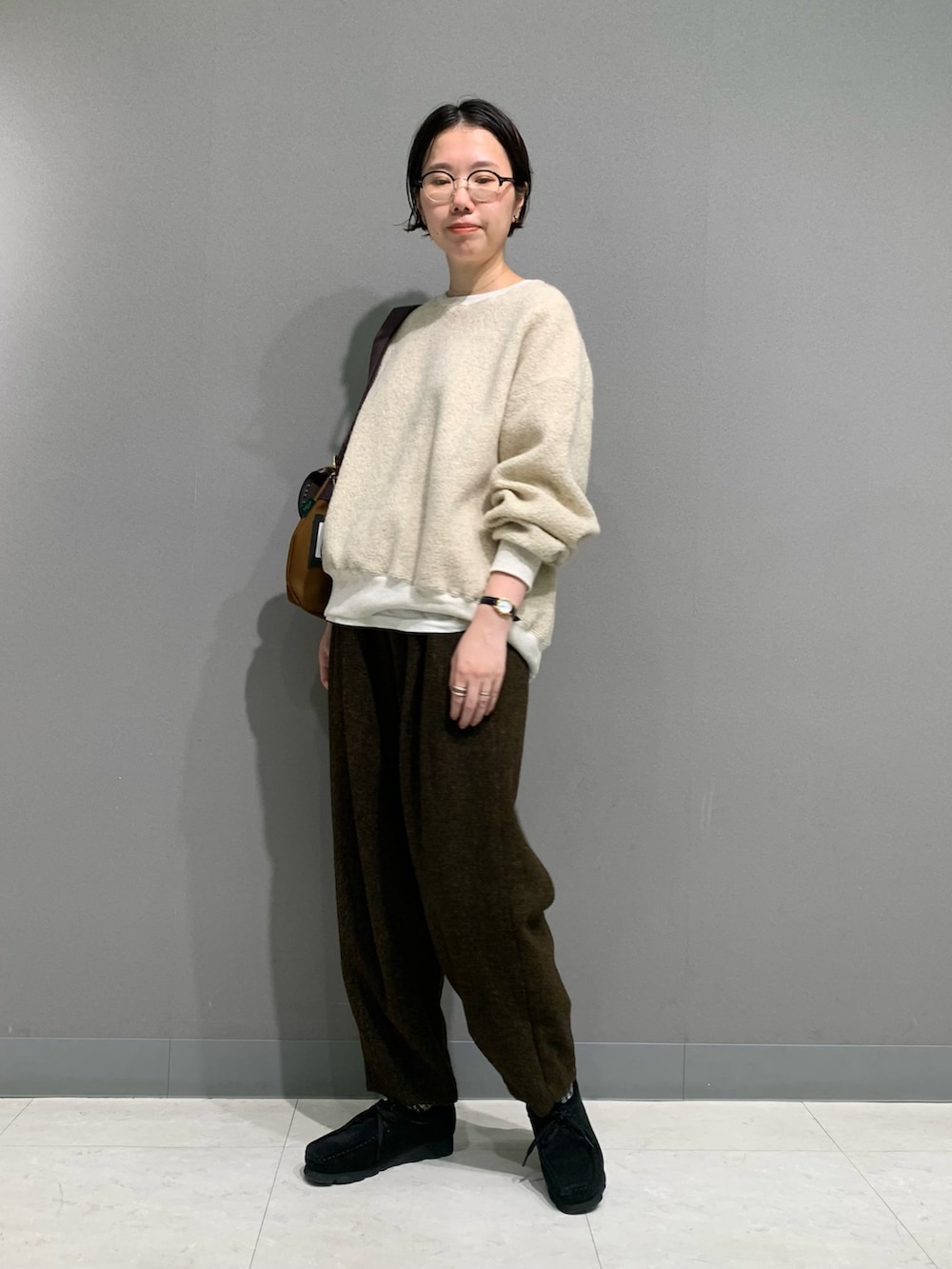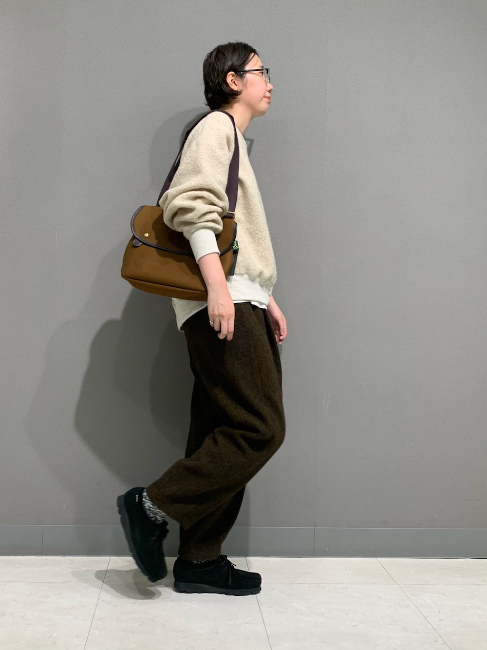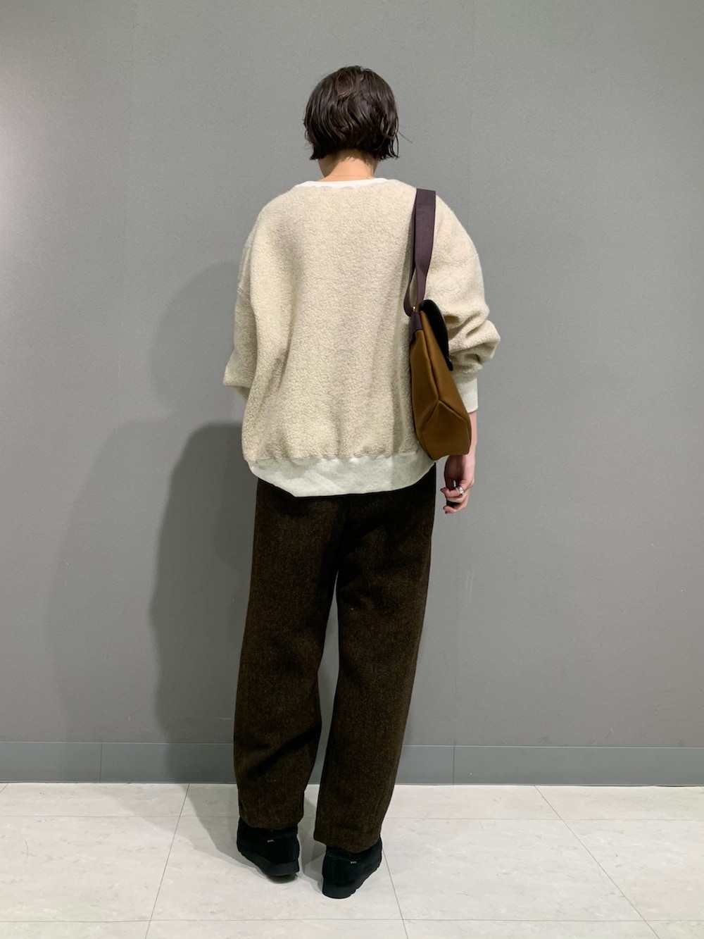 ヘリンボーン織のふっくらとした生地感のパンツ。奥行きのある色味が素敵です。ウールの温かさもありつつ裏地がしっかり付いているので風を通さずお召しいただけます。