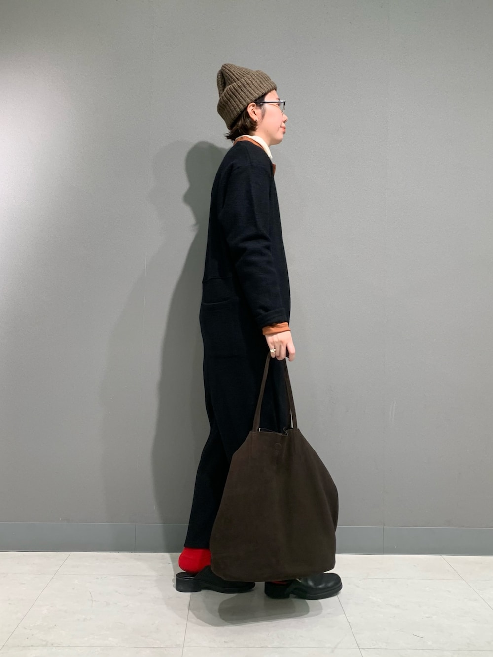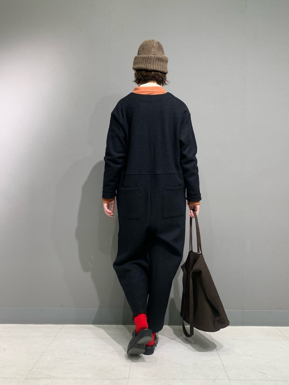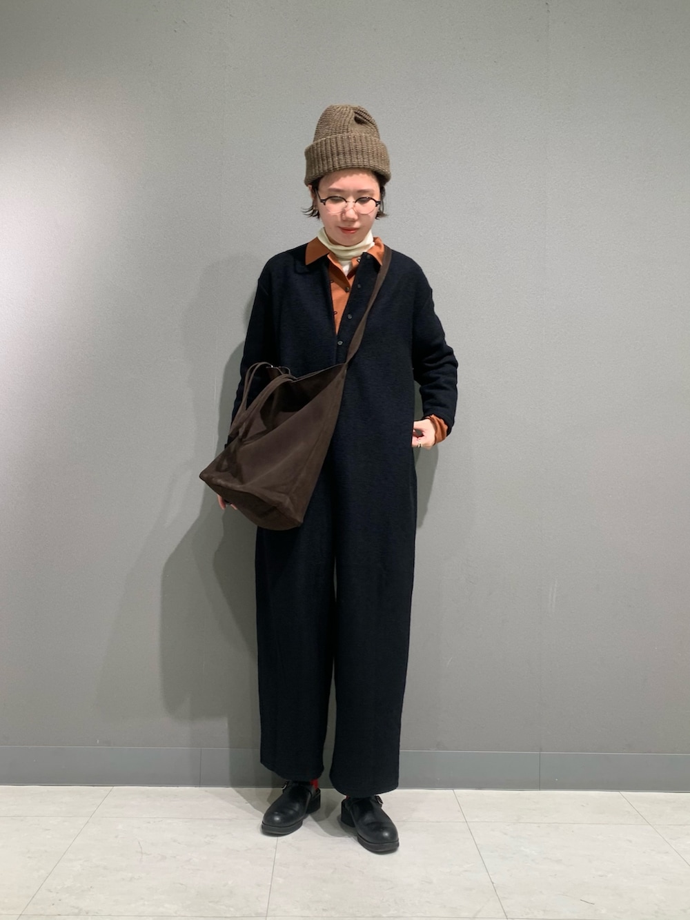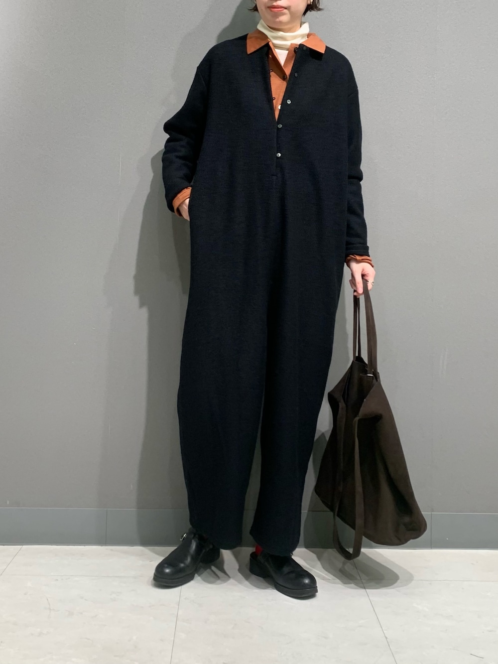 ウールブークレーのふっくらとしたオールインワンは軽く着やすいです。フロントボタンを開けると深めに開くのでシャツやタートルのレイヤードをしていただくと雰囲気がガラッと変わります。今回はタートルとウールシャツを重ねて着ています。