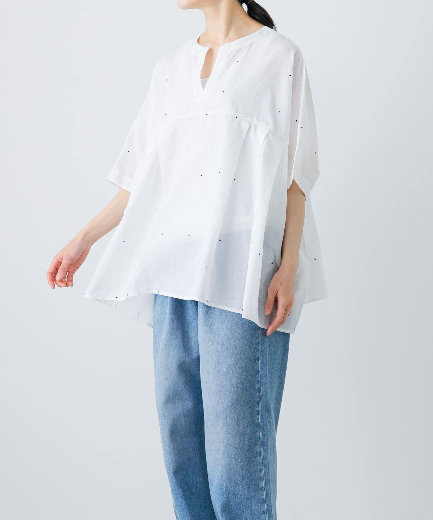 カジュアルになりすぎないように、ドットの刺繍が入ったPOをあわせてみました。大人のシンプルスタイルにです。