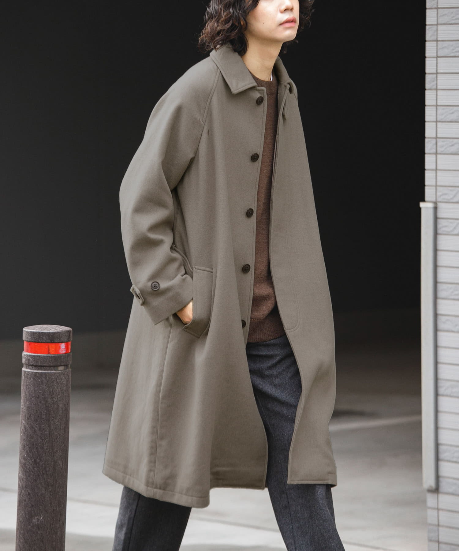 ふくらみのあるウール素材を使用した、ベーシックなこちらのベルトロングコートですが、サイズ感はそこまでオーバーさが無く、お仕事から普段使いまで幅広く着用して頂けるデザインとなっております。
