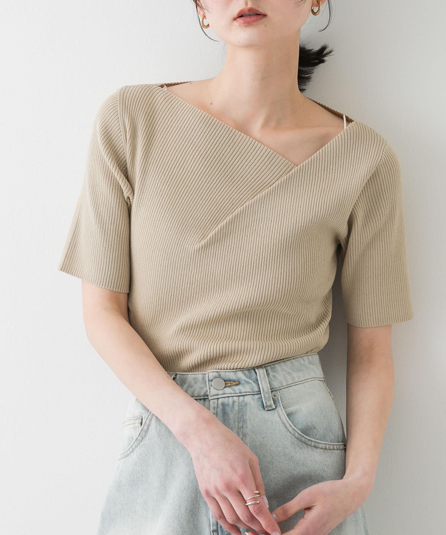 SENSE OF PLACE『一部WEB限定カラー』アシメネックハーフスリーブセーター- 着用カラー:
