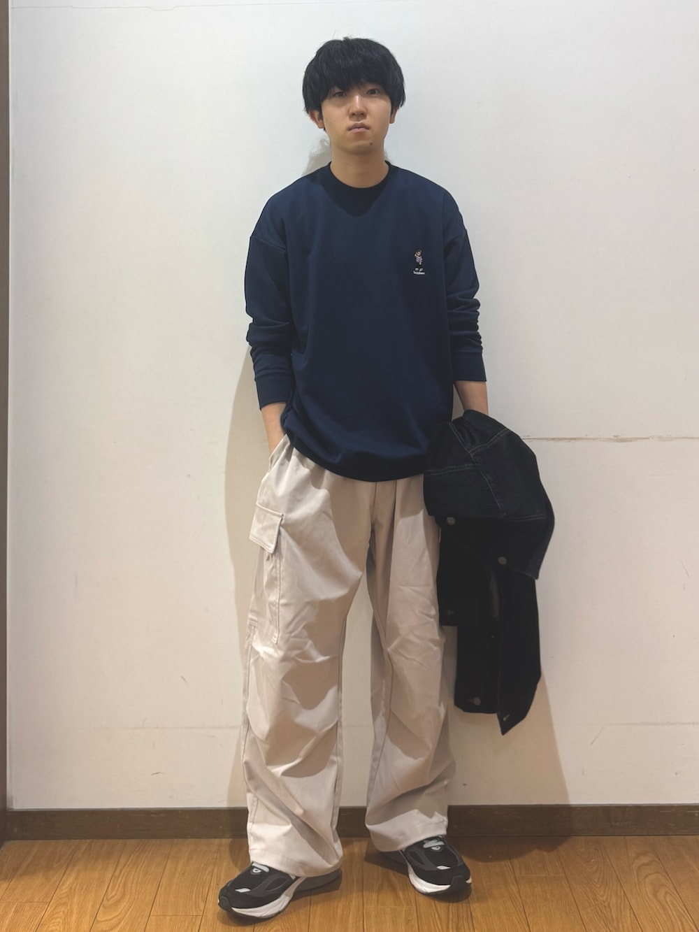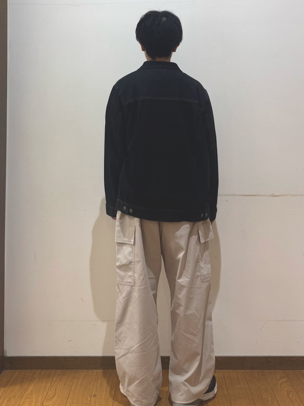 デニムジャケットにカーゴパンツを組み合わせ、カジュアルにまとめました
