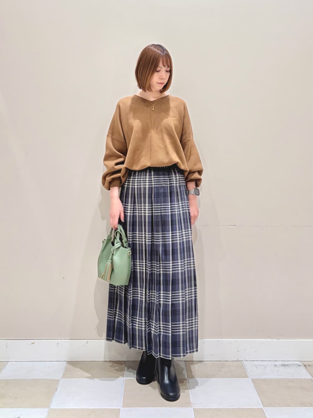 さらっと羽織れるマウンテンパーカーにフルーツのプリントがポイントのワッフルロンTにシックなカラーのタイトスカートでカジュアルな秋スタイルに。