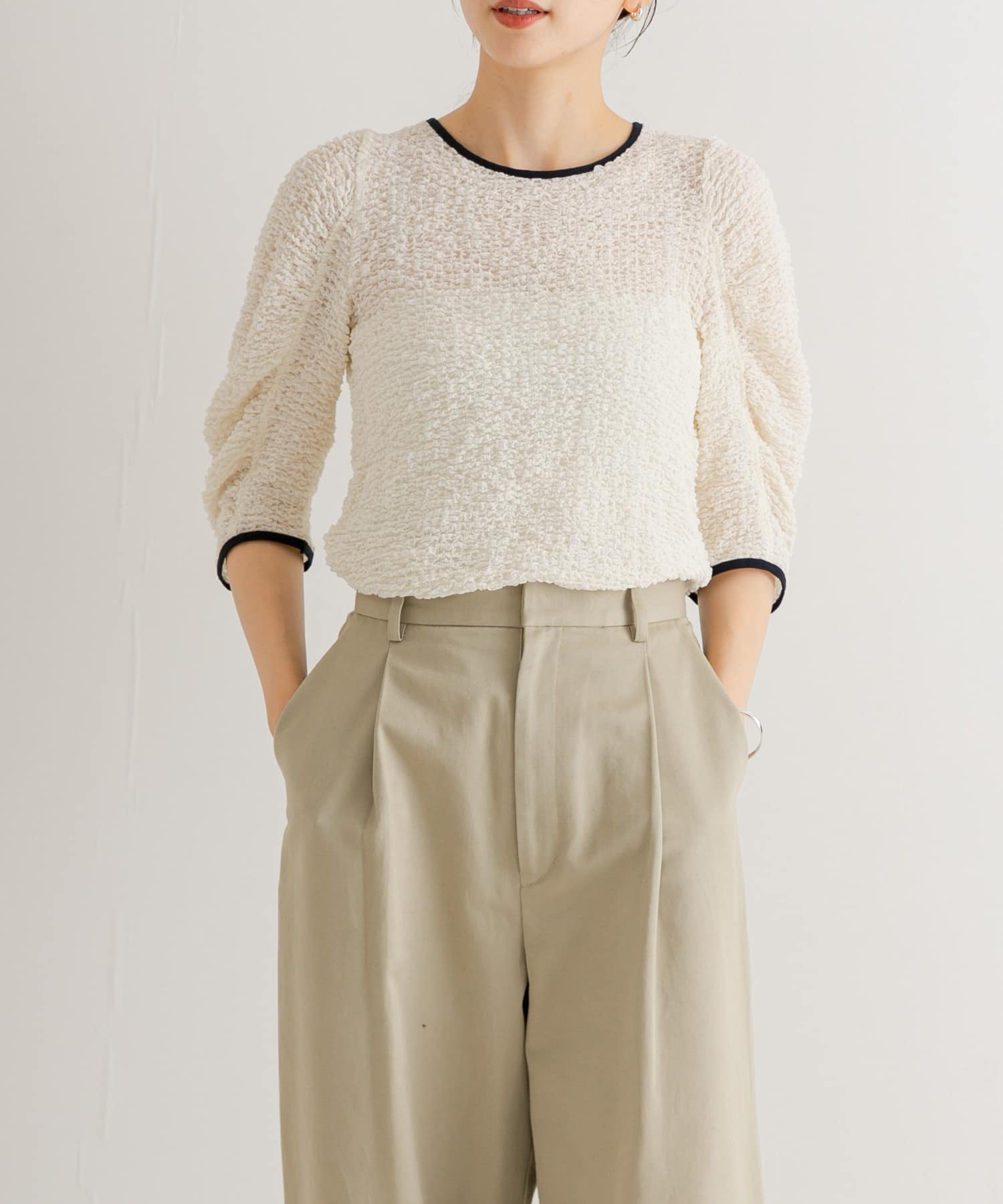 トップスはシャーリングTで色味かとても可愛いアイテムになっています!袖も長めになっていて可愛いです!