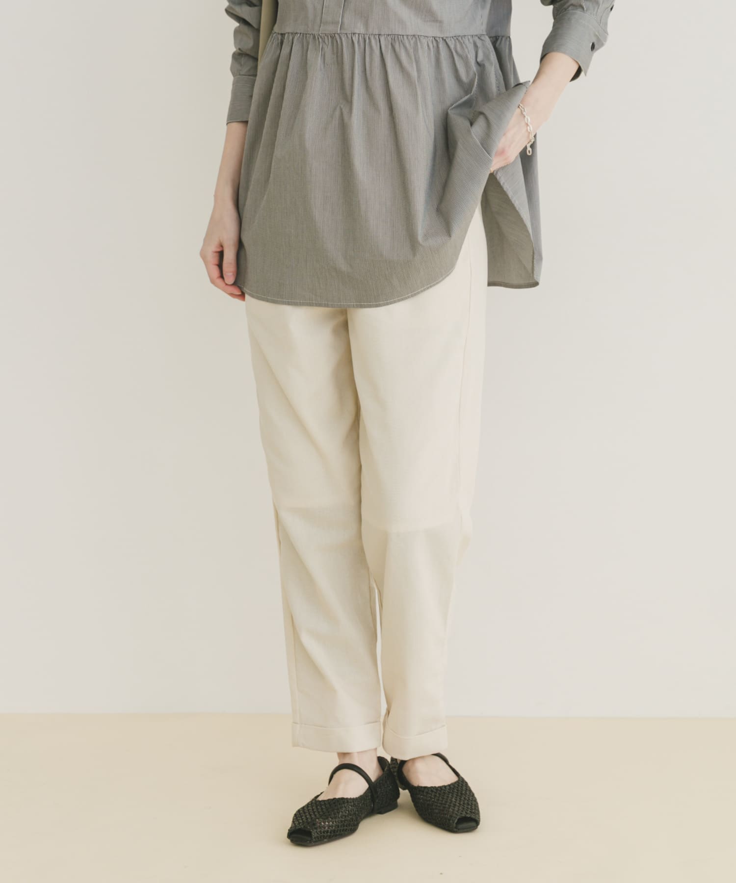 リネンが入ったさらっと履ける、涼しげなウエストゴムのテーパードパンツ。