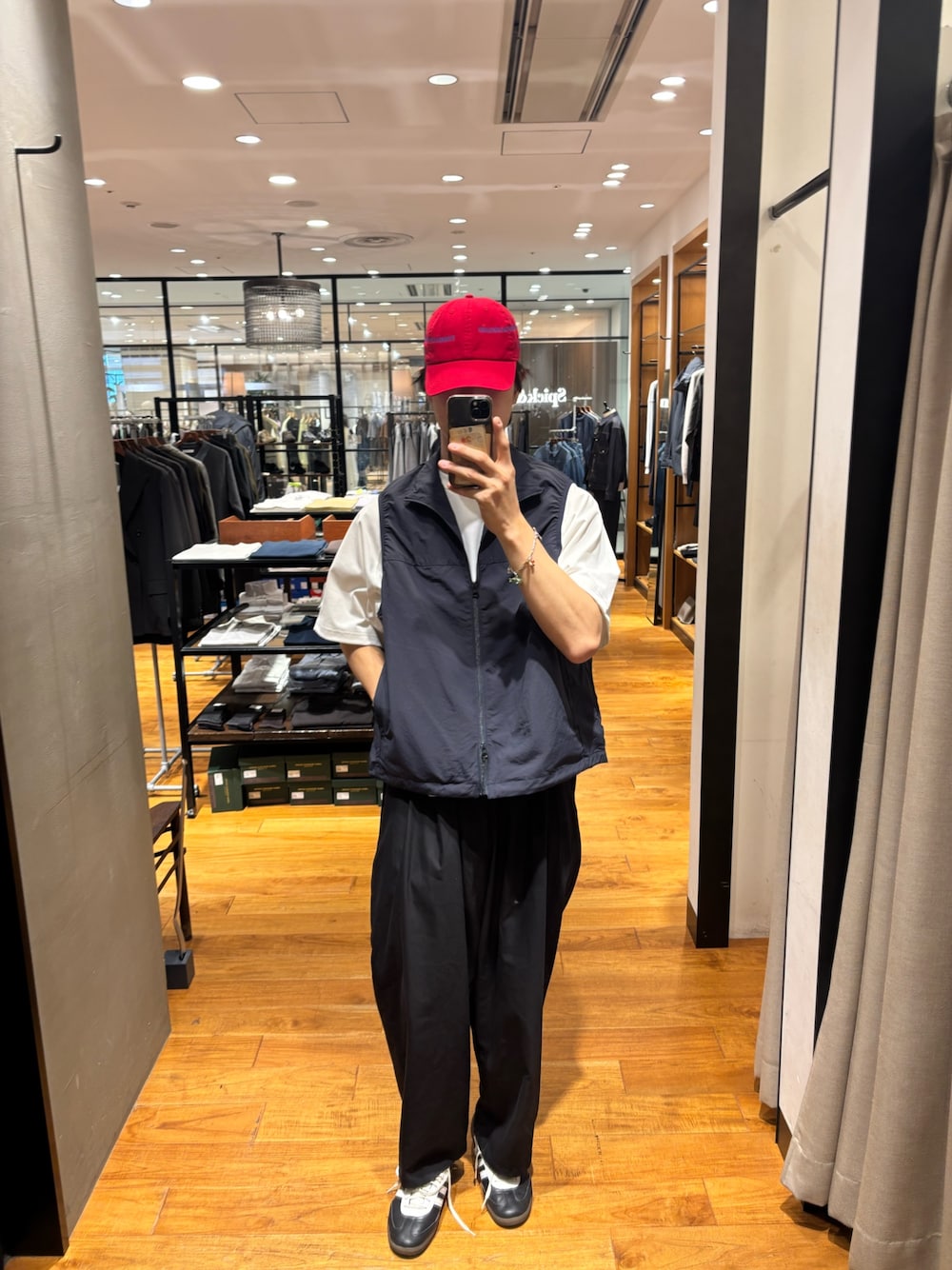 オーバーサイズの別注BEDALEはスラックスに合わせて落ち着かせる。でも中のスエットは遊び心たっぷり。