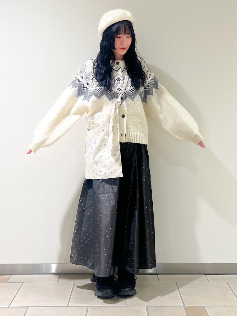 スカートは外側にポケットがついたカーゴデザイン。綺麗見えする素材でシワにもなりにくいので合わせてみました。ポケットがあるので通常のタイトスカートよりもラインが気にならないですよ♩