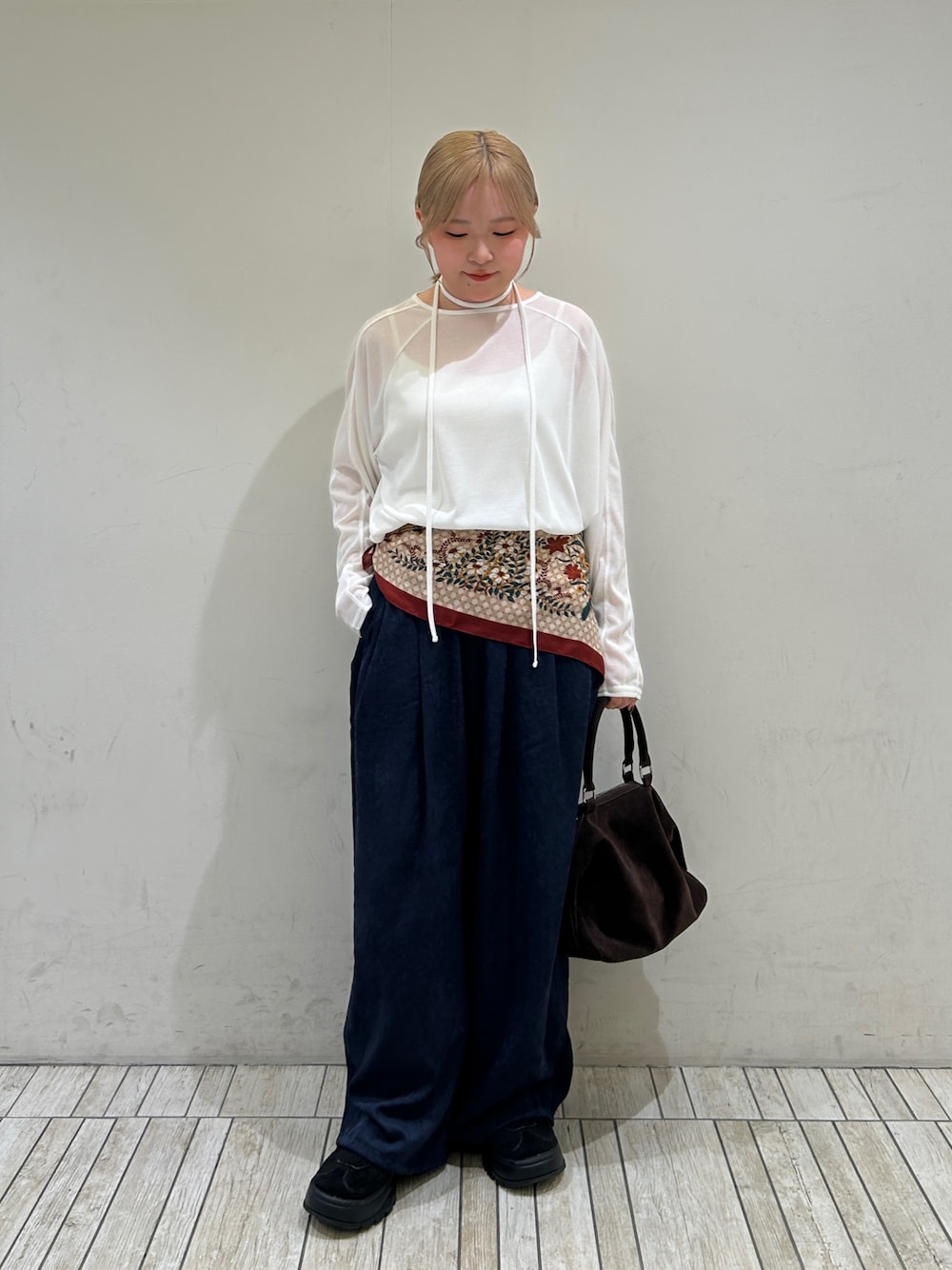 ネイビーの落ち着いた色をチョイスしたので、重くなりすぎないように相性のいいアイボリーのパンツを選んでカジュアルさを消さないようにしてみました!