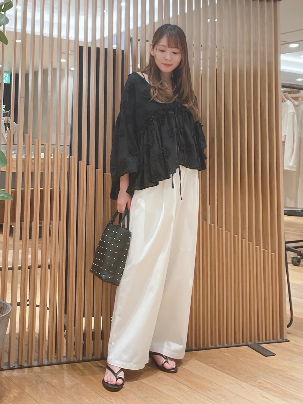 インナーにはカップ付きキャミ一枚で着ていますが、いやらしさのない上品な透け感。
