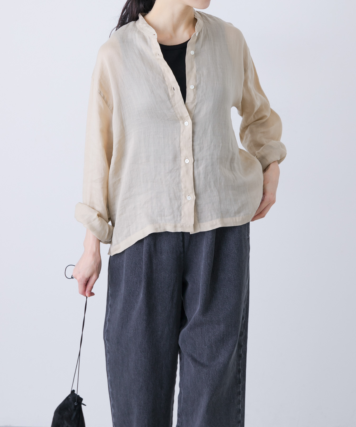 秋口まで長く使えるラミー素材の薄手で涼しいシャツです。シャリ感がありサラッと快適に着用頂けます。