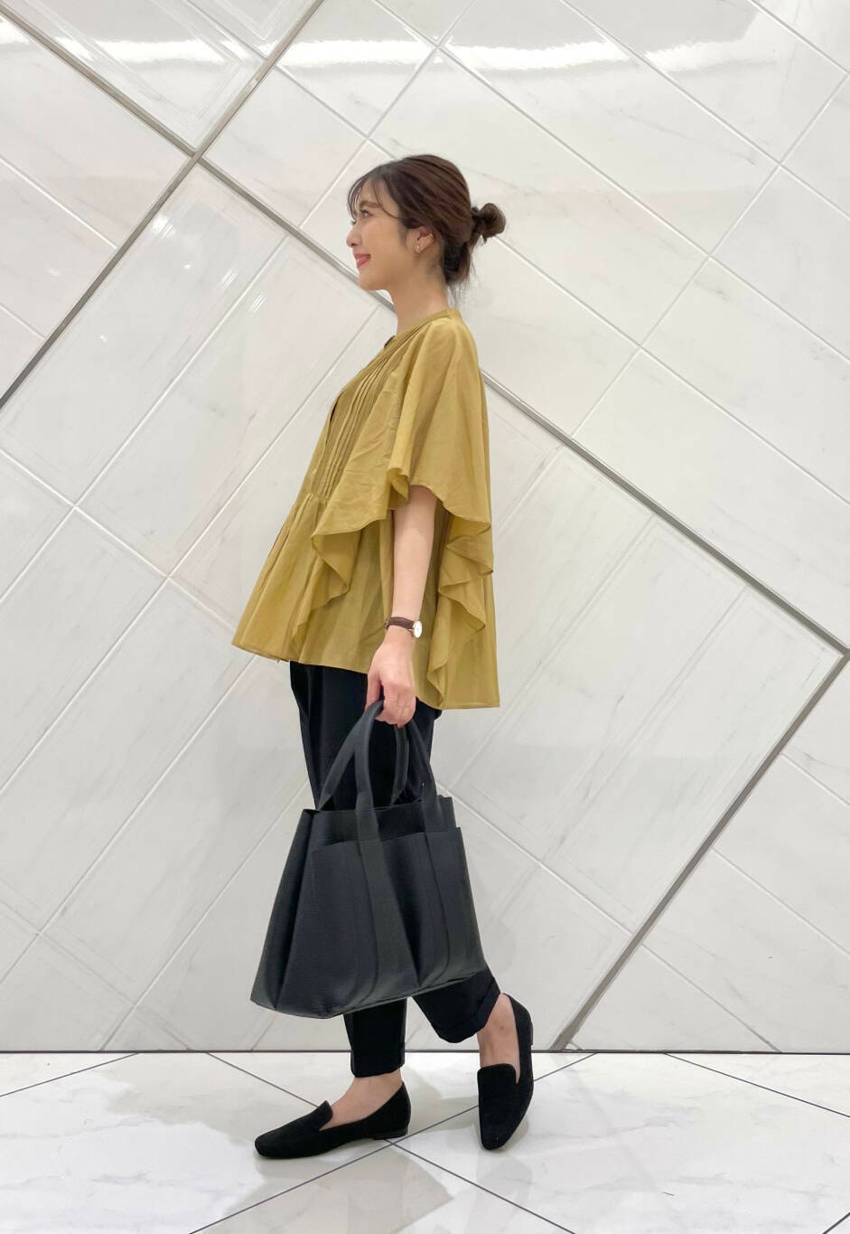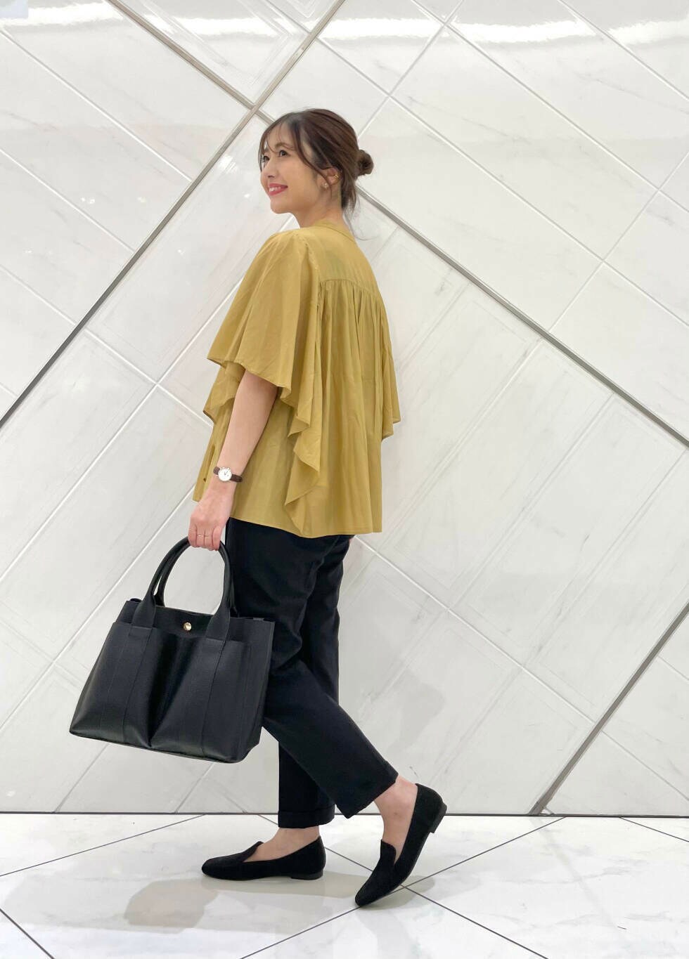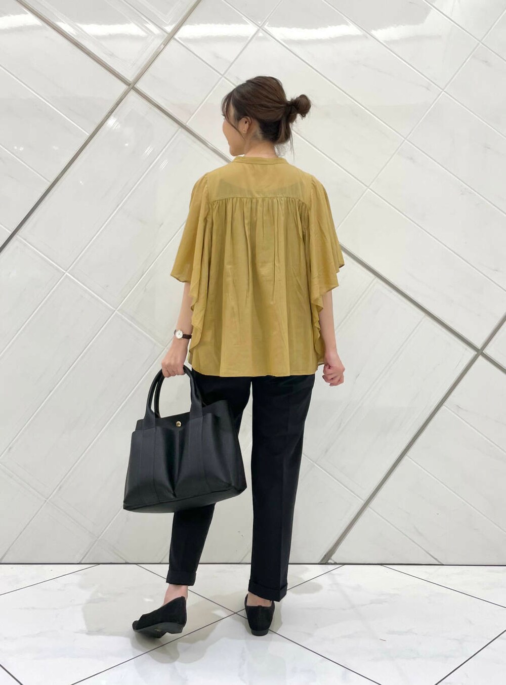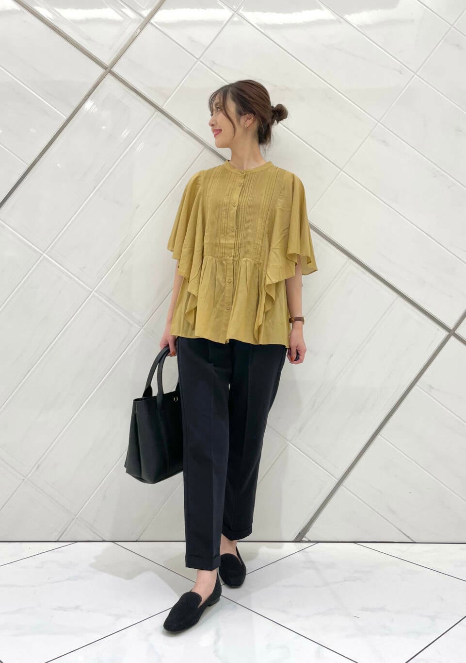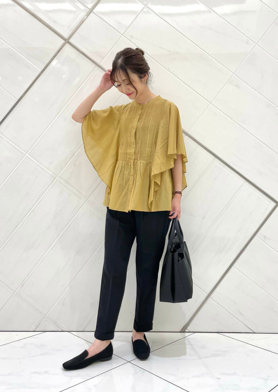 フリルスリーブで二の腕がカバーでき、ボトムスも合わせやすいです(^^)