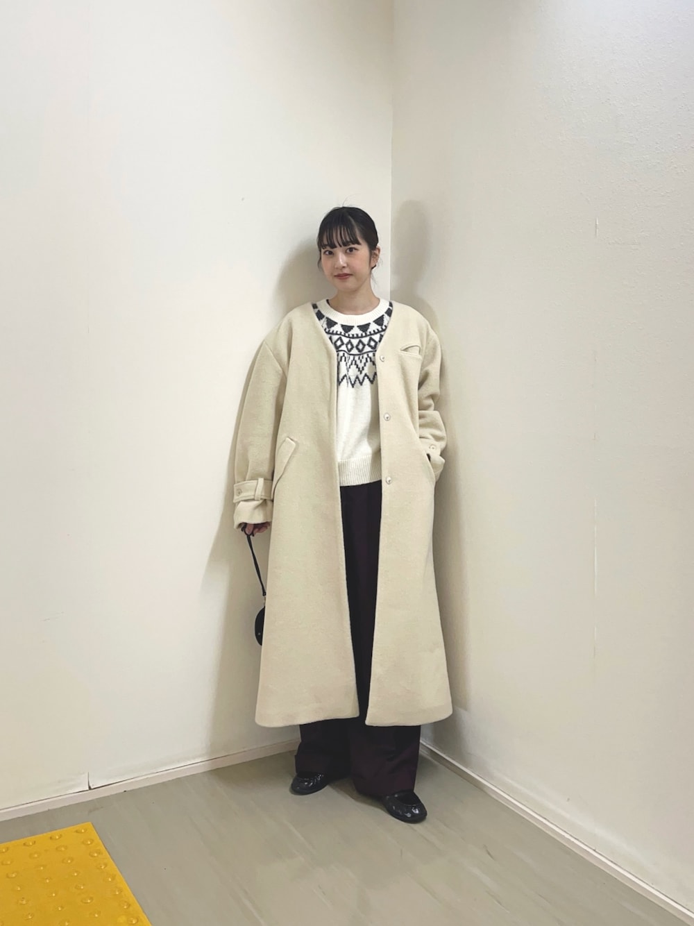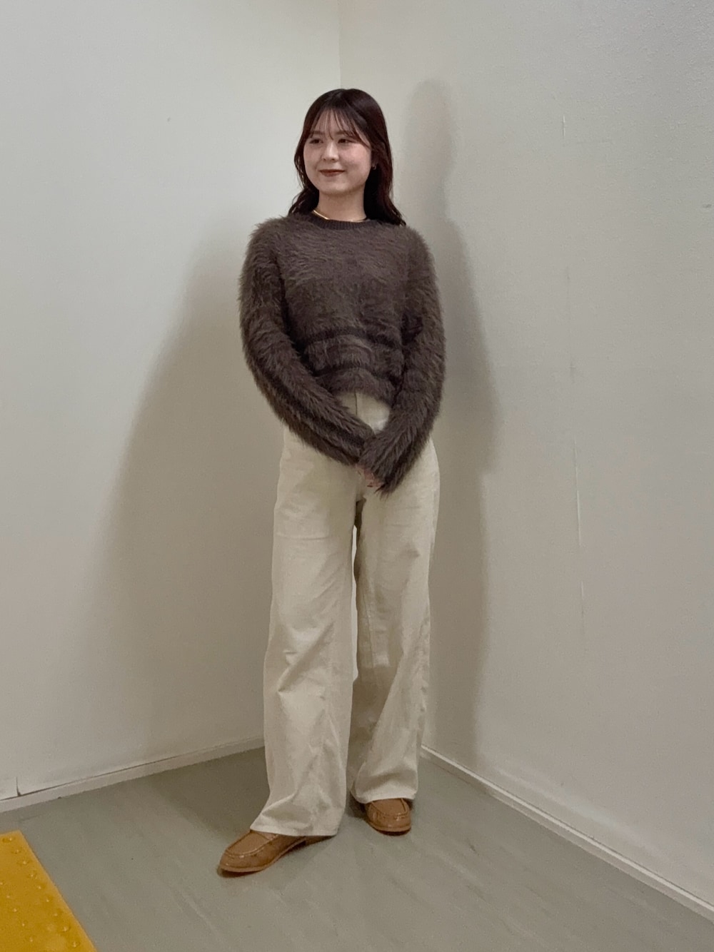 コンパクトなニットなので下のボタンを開けて着るとバランス良く着て頂けます!