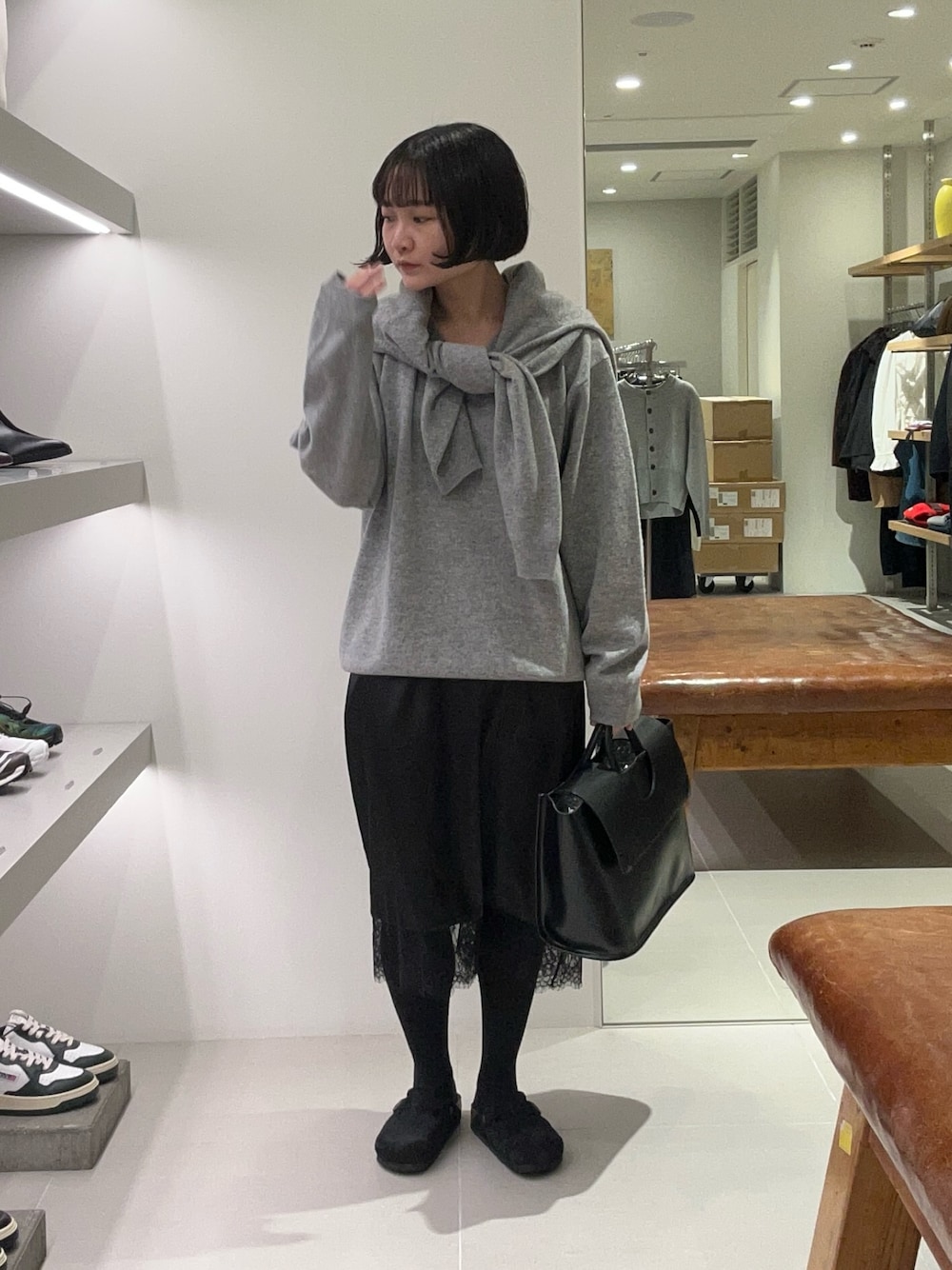 ふわふわした毛足の長いニットは存在感があり、コーディネートのポイントになります。