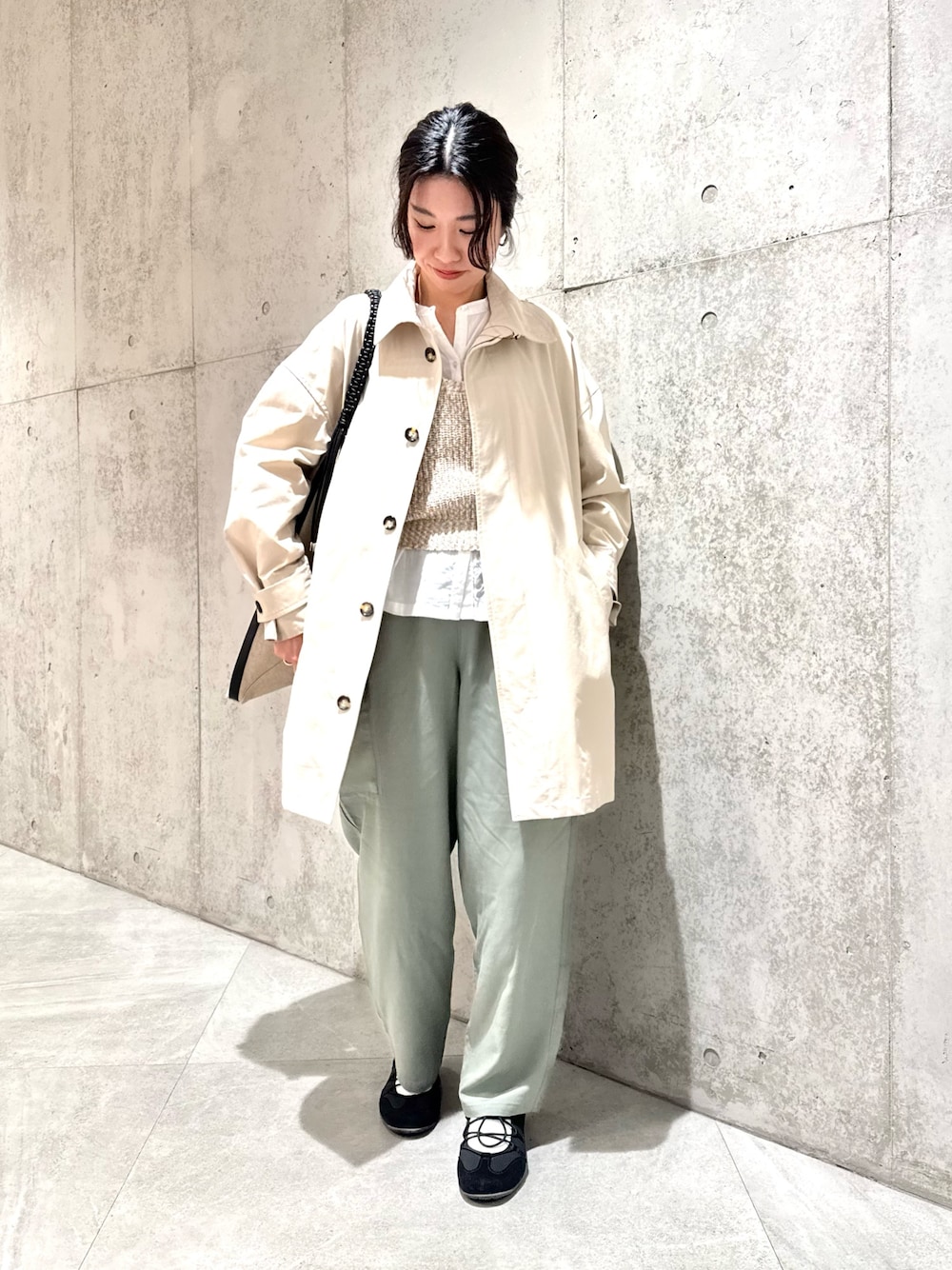 今回は、ミントカラーのニットをアクセントにしたコーディネートです。