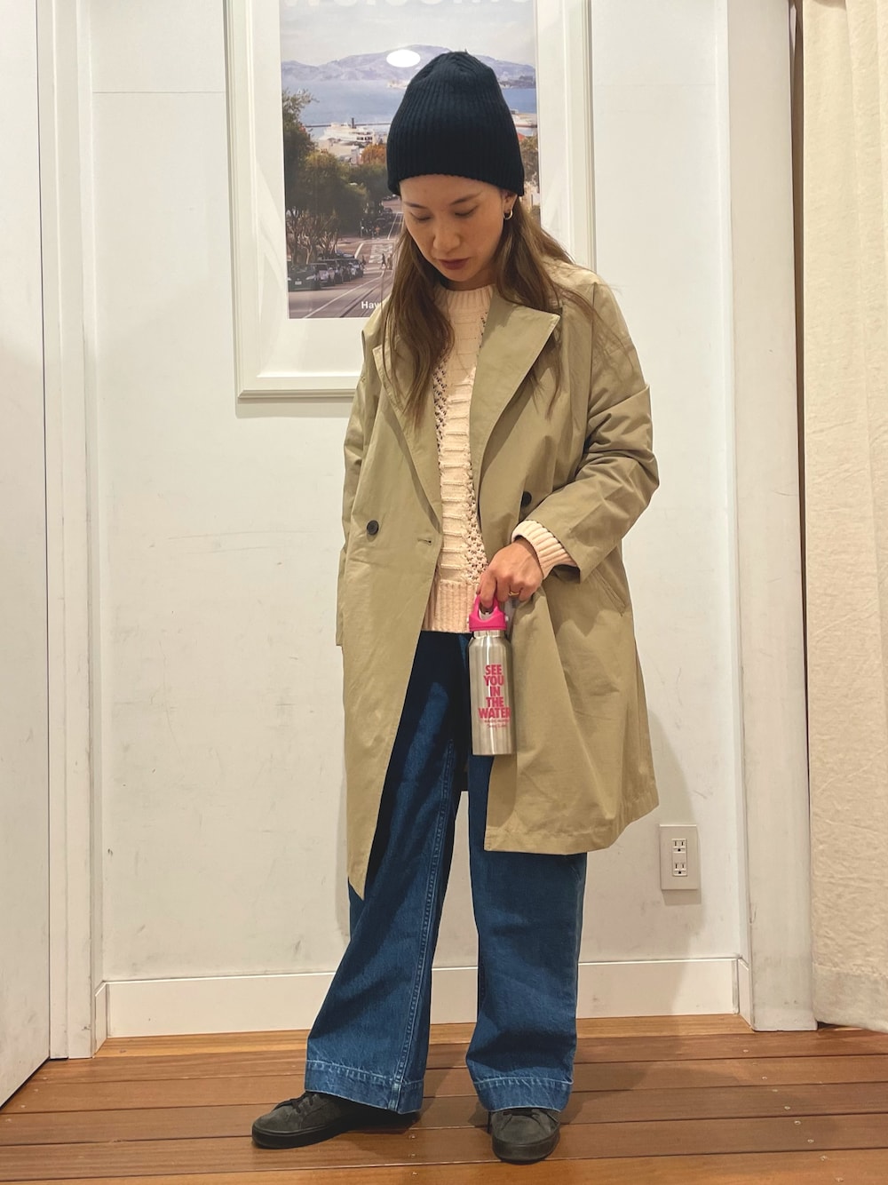 着用のウールリバーミドルガウンコートは、オーバーシルウェットでトレンド感がありとてもおしゃれなコーディネイトに仕上がります!