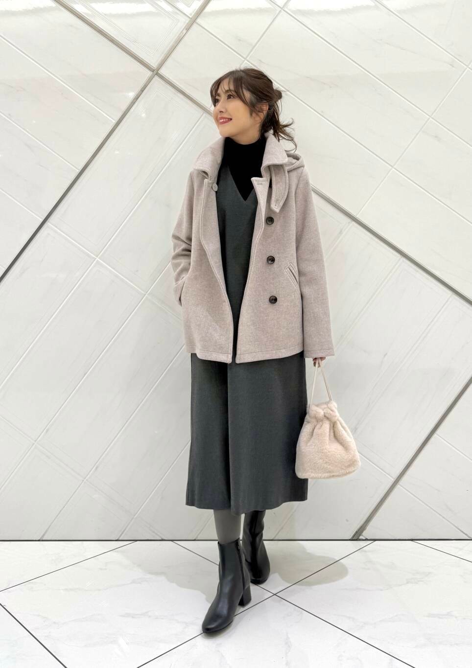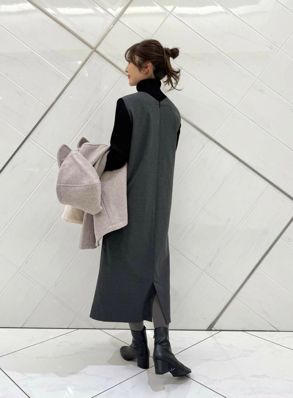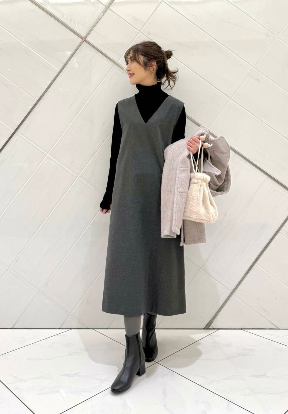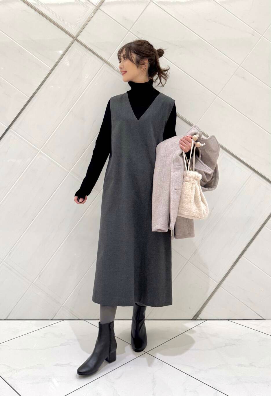 ジャンパースカートはタイト目ですっきりとしたIラインのシルエットでスタイルよく見えます。