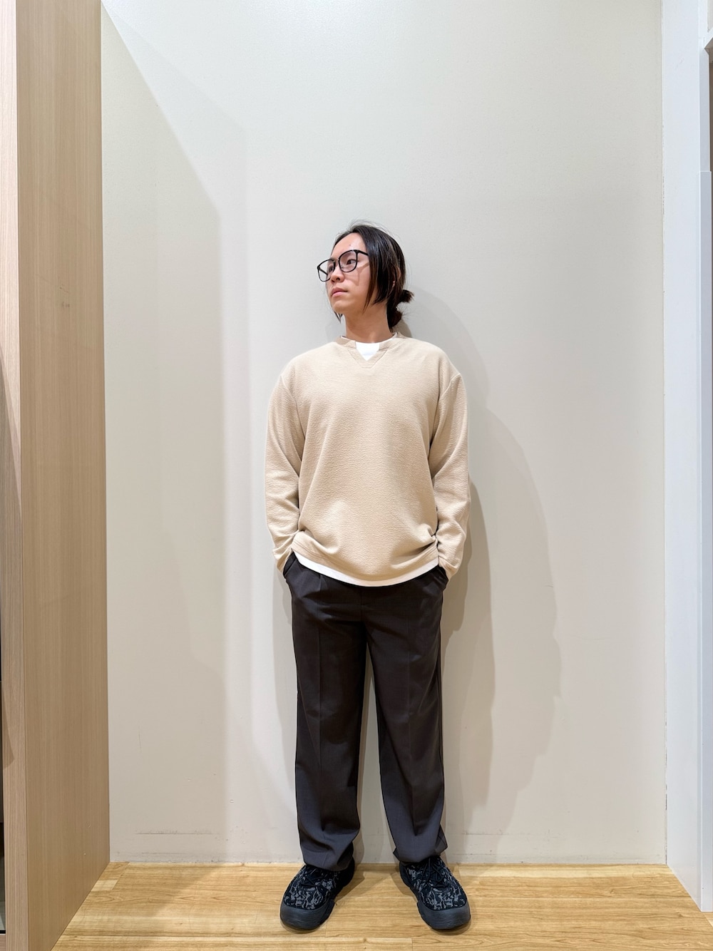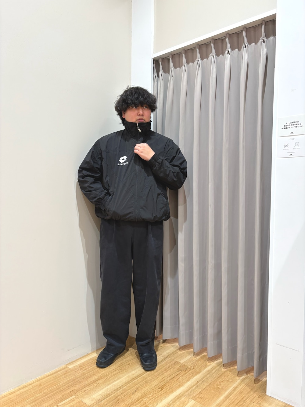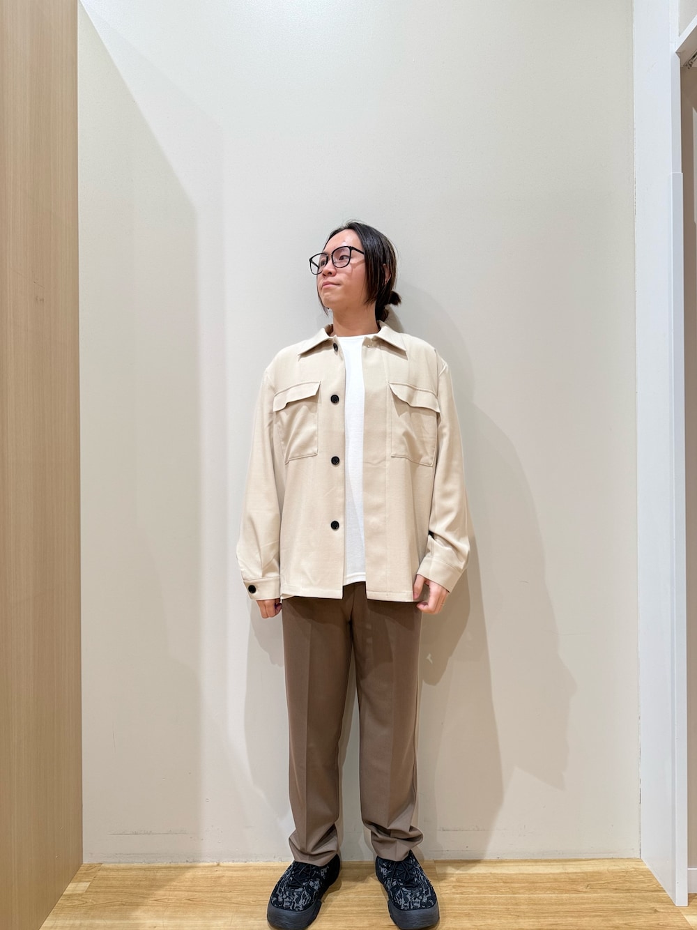 アウター、ニット、パンツすべてMサイズを着用しております。