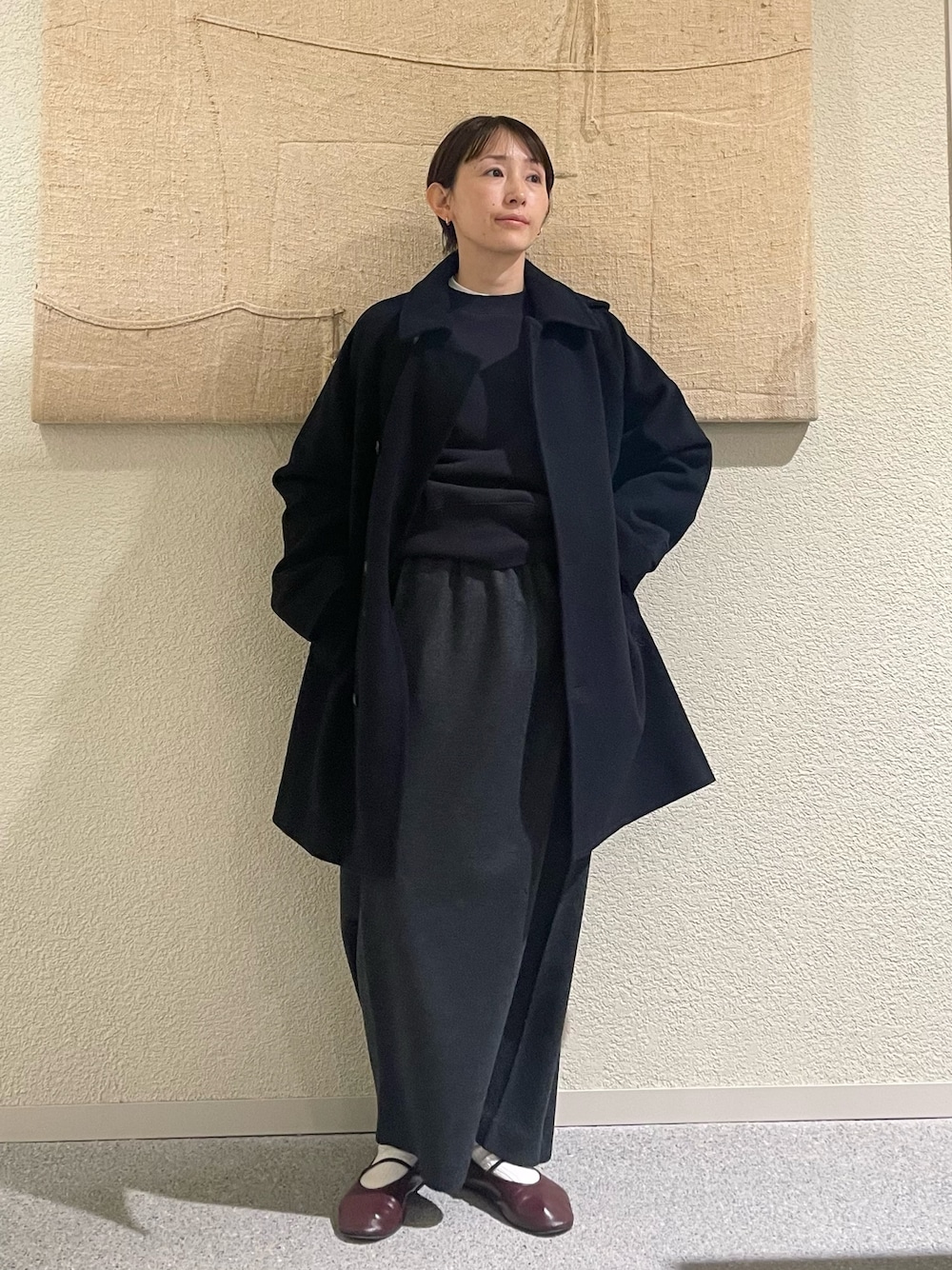 上品なフレアシルエットが美しいウール素材のロングワンピース。ほどよい厚みで一枚でも着映えし、動くたびに揺れるラインが女性らしさを引き立てます。ブラックカラーが全体を引き締め、シックで落ち着いた印象に。