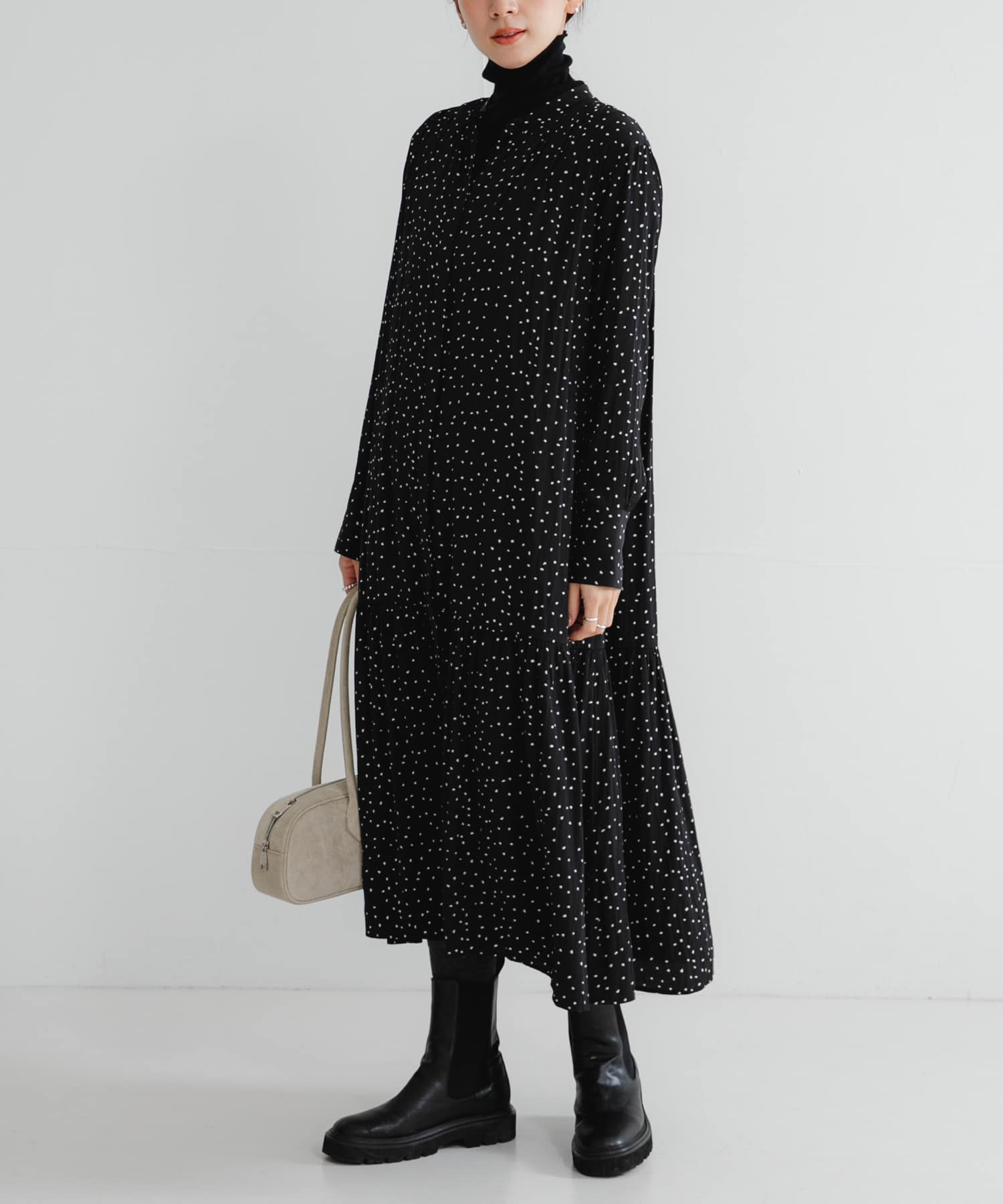 今回は、ドット柄のワンピースと合わせた、大人カジュアルコーディネートです。