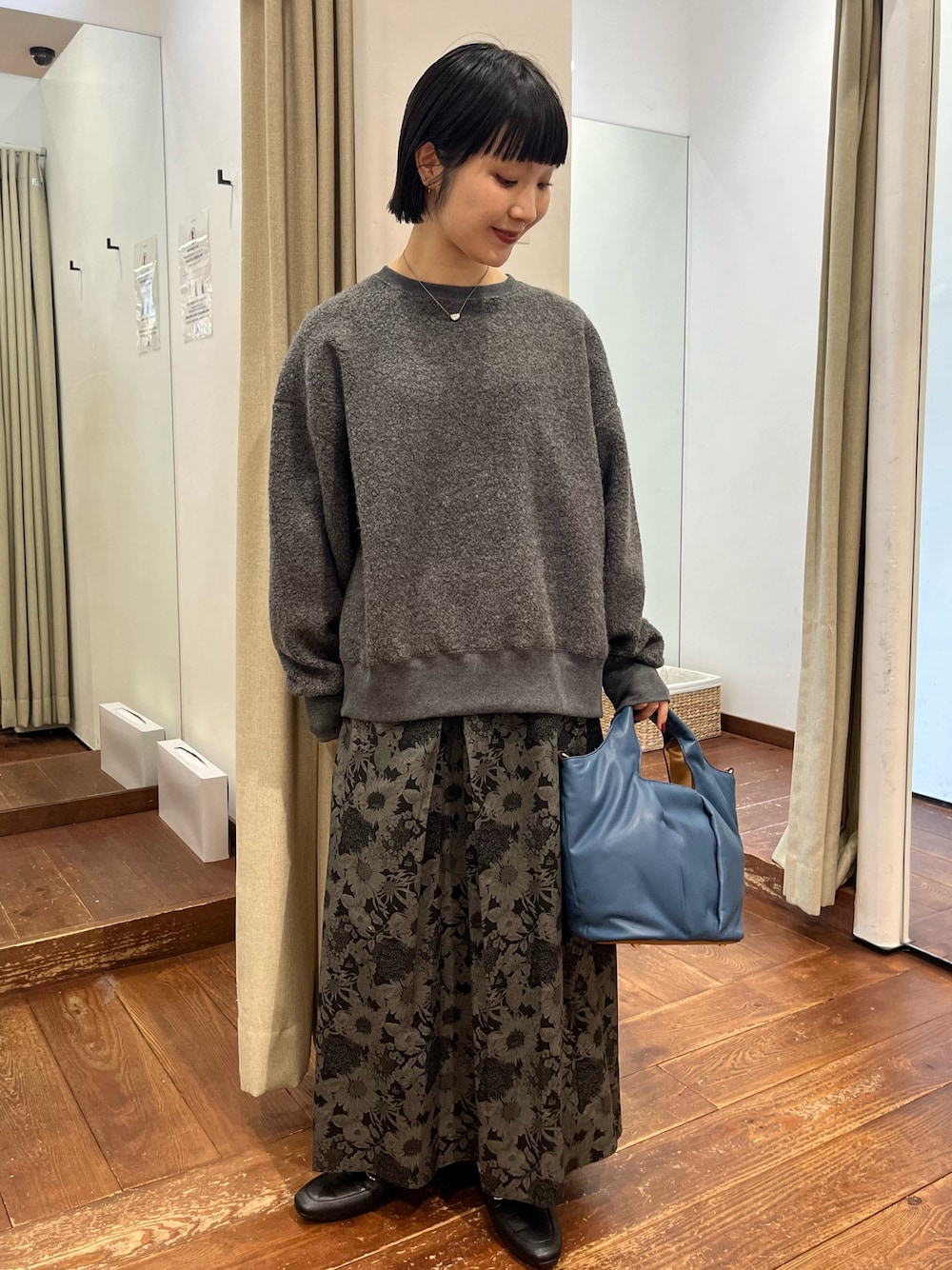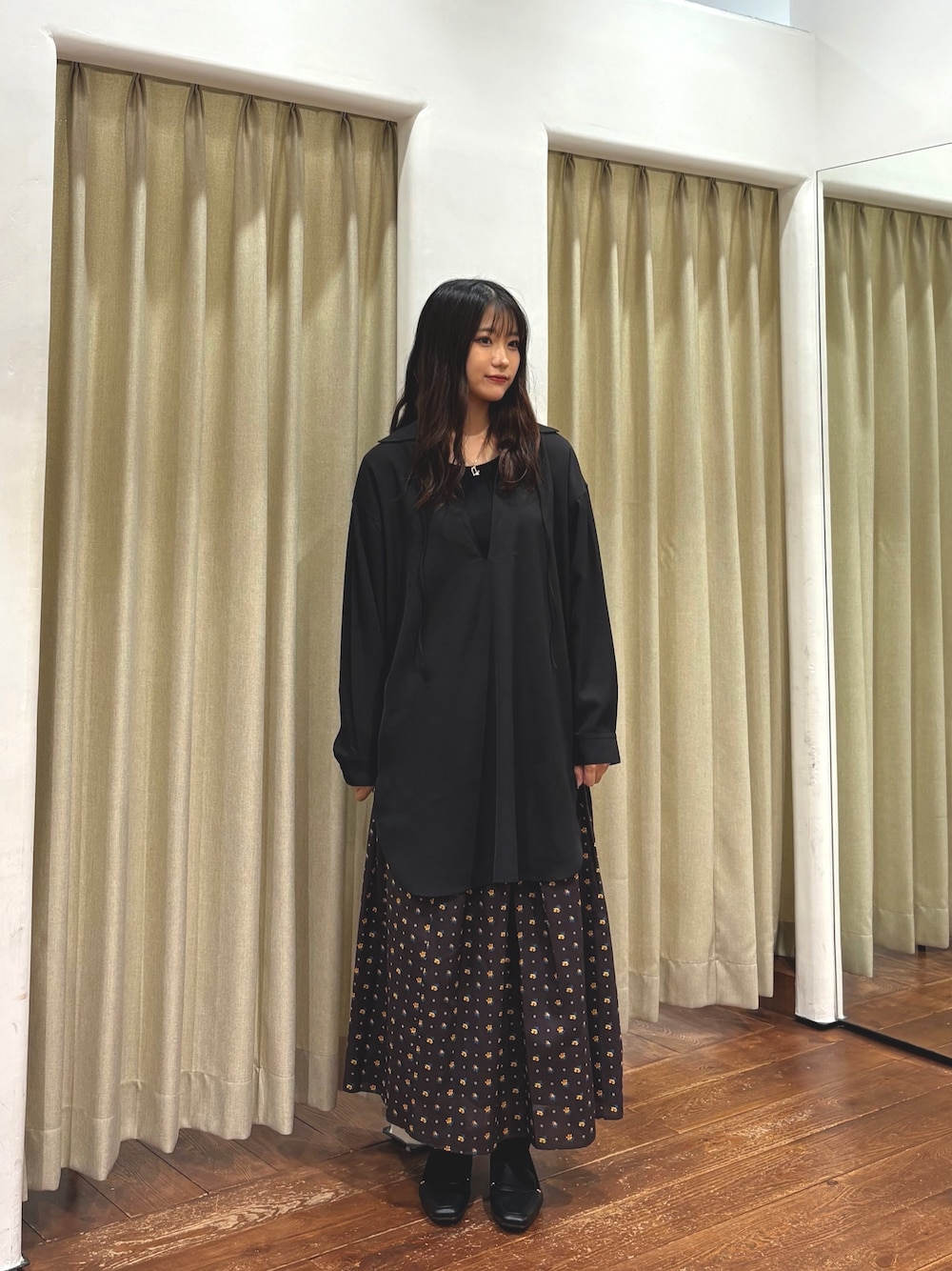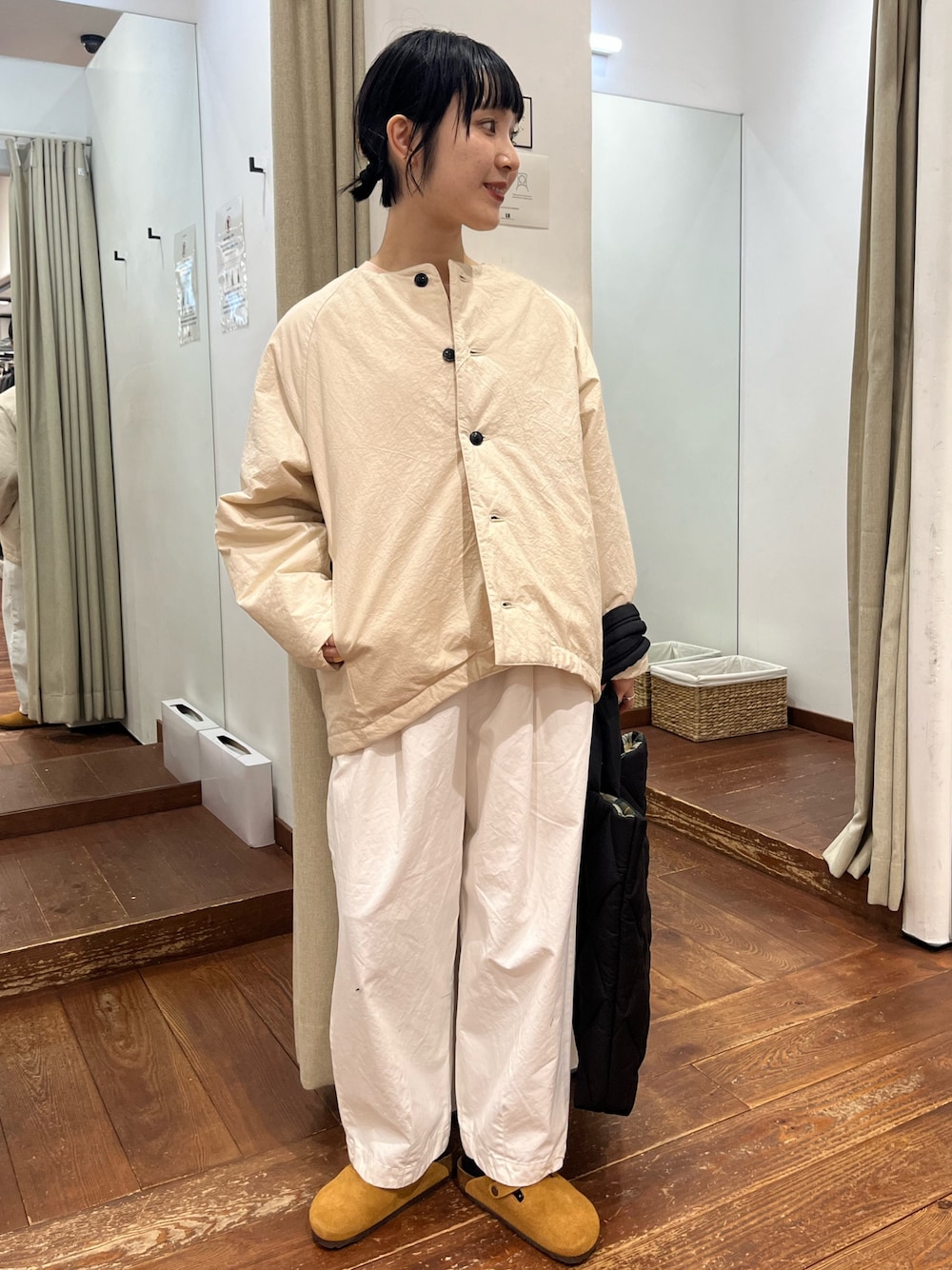 あえてオーバーでカジュアルな雰囲気のアウターと組み合わせました。