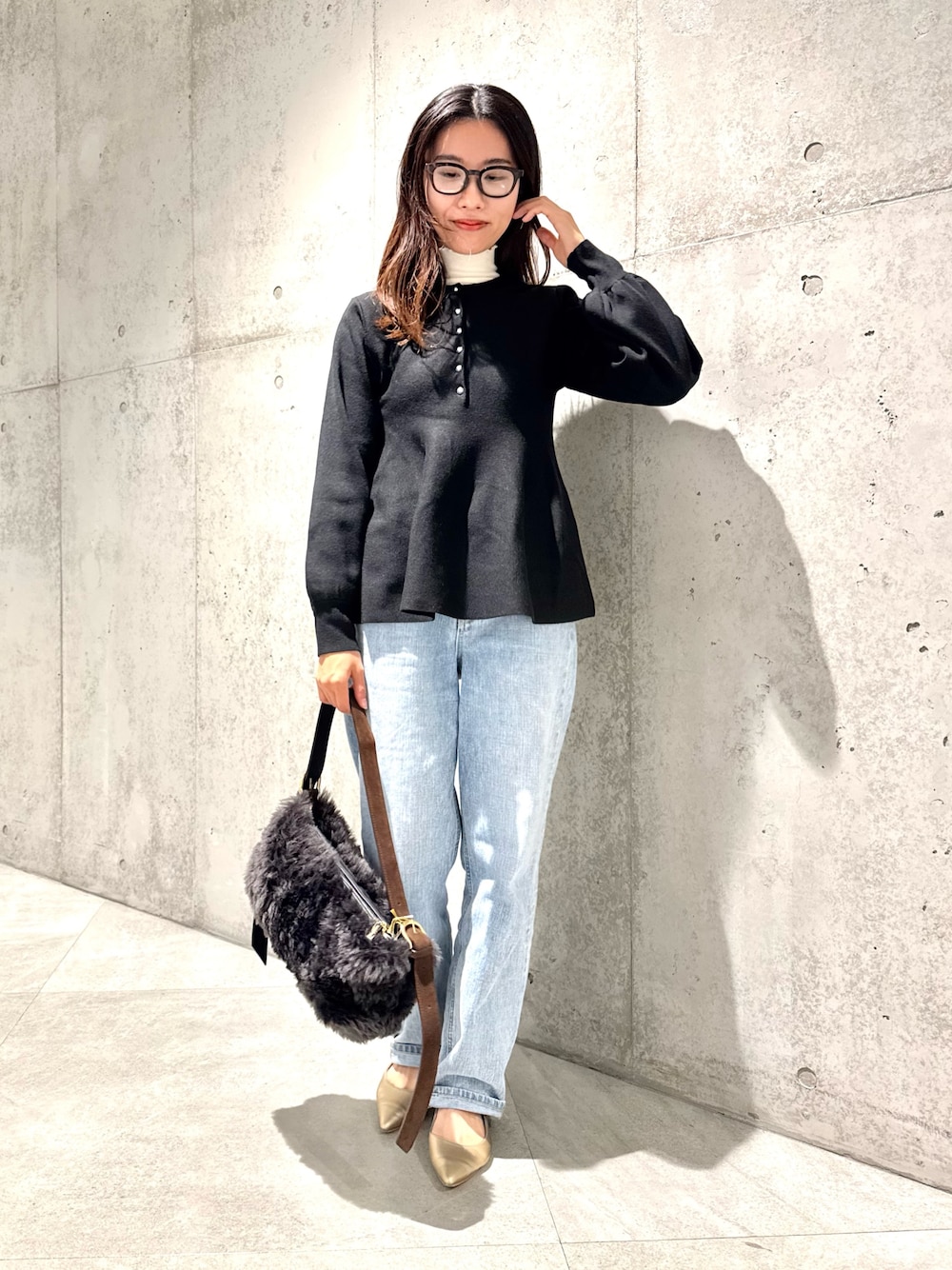 クリアボタンで抜け感を演出し、重くなりがちな秋冬のスタイルに軽やかさをプラス。