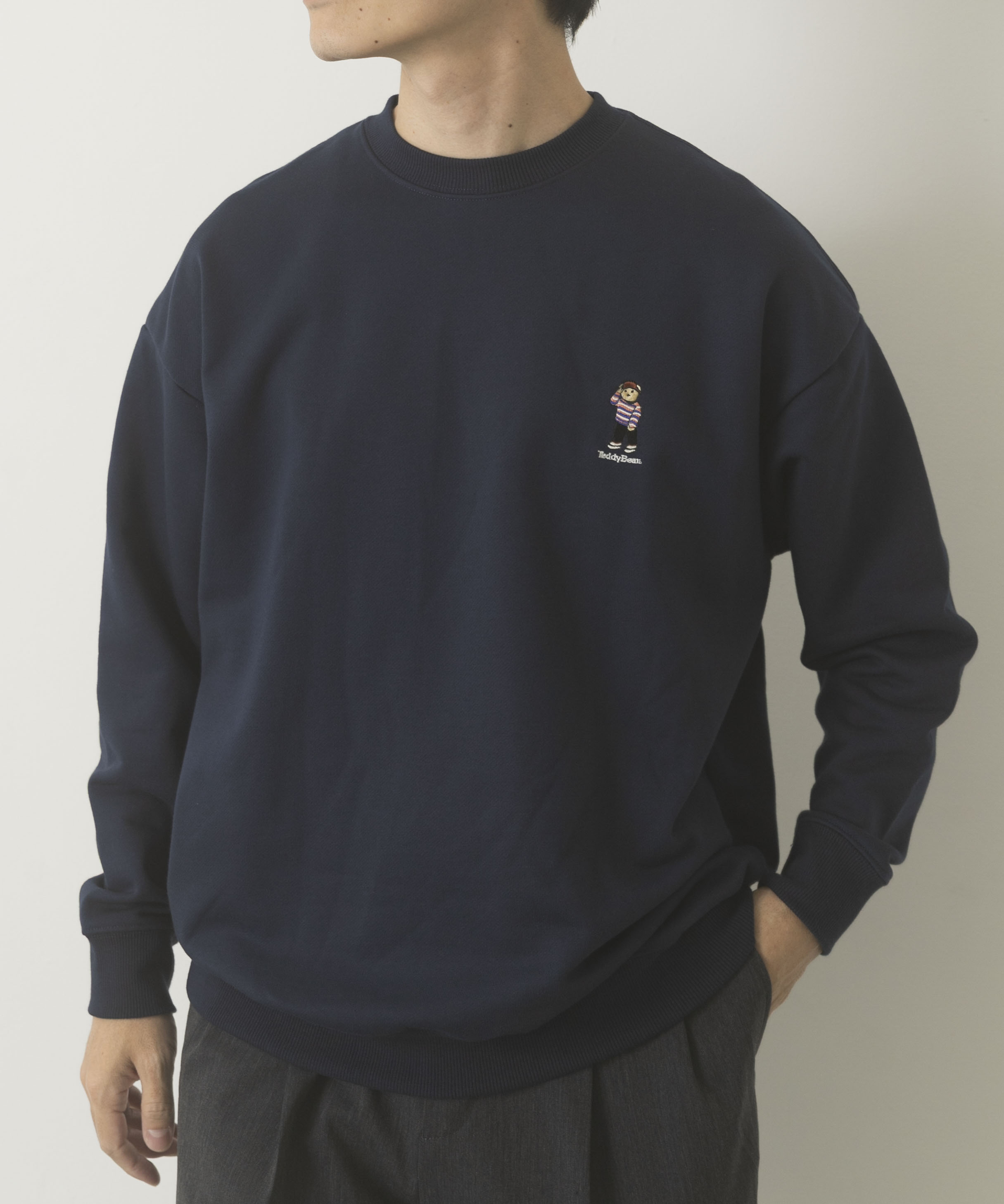 トップスはテディベアの刺繍が特徴的なスウェットです!シャツやパーカーをレイヤードするなどの工夫で寒い時期でも活躍できます!
