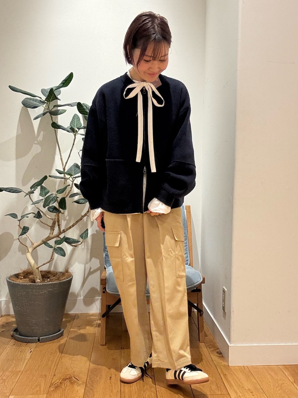 フリルシャツの襟がチラ見えも大人かわいいポイントですね〜
