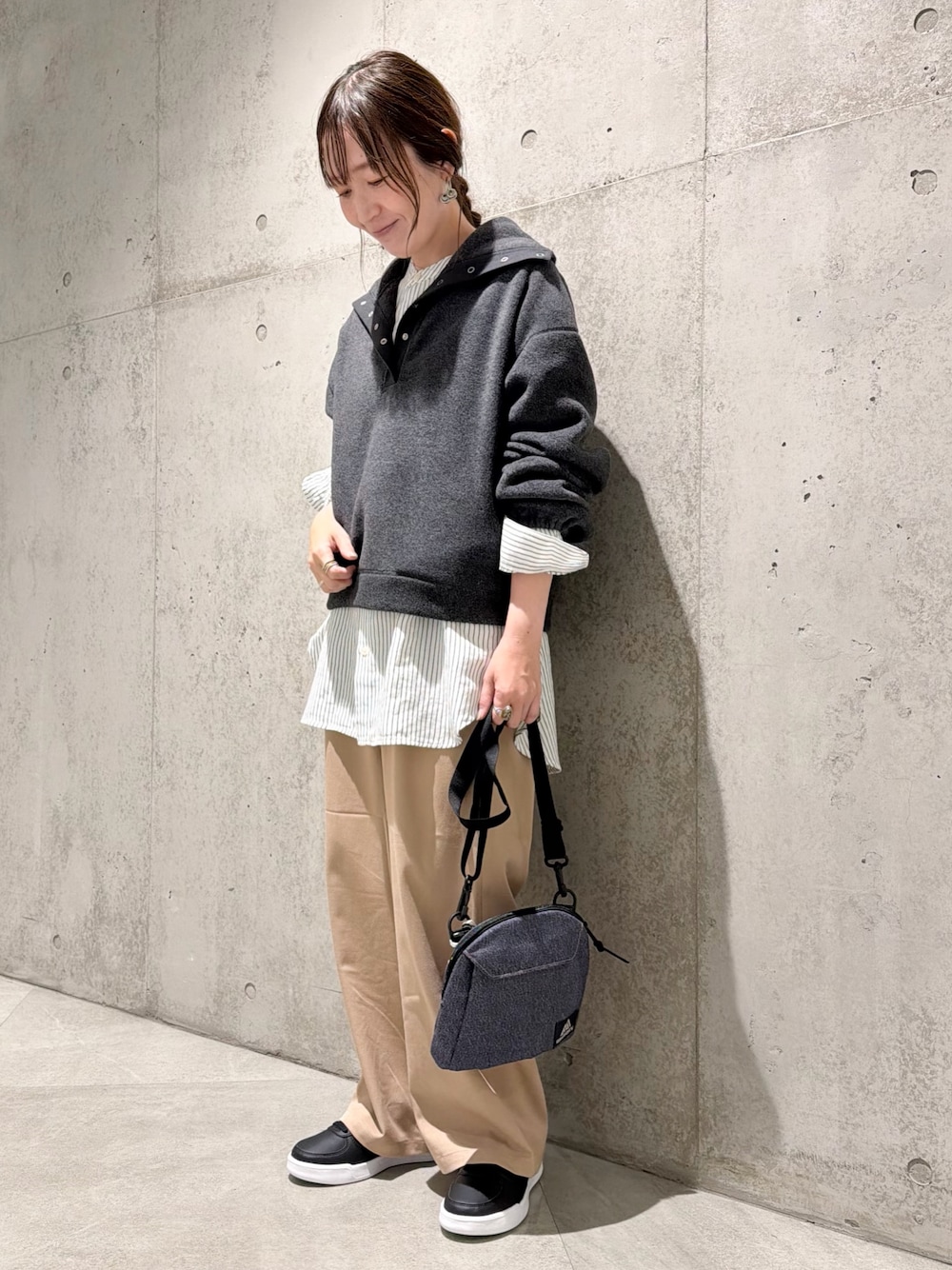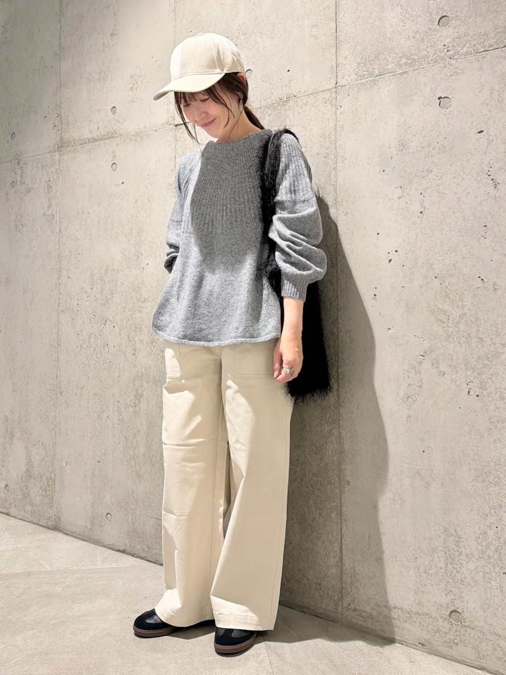 今回は、秋冬らしいツイード調の生地が特徴的なパンツと合わせた、キレイめカジュアルコーディネートです。