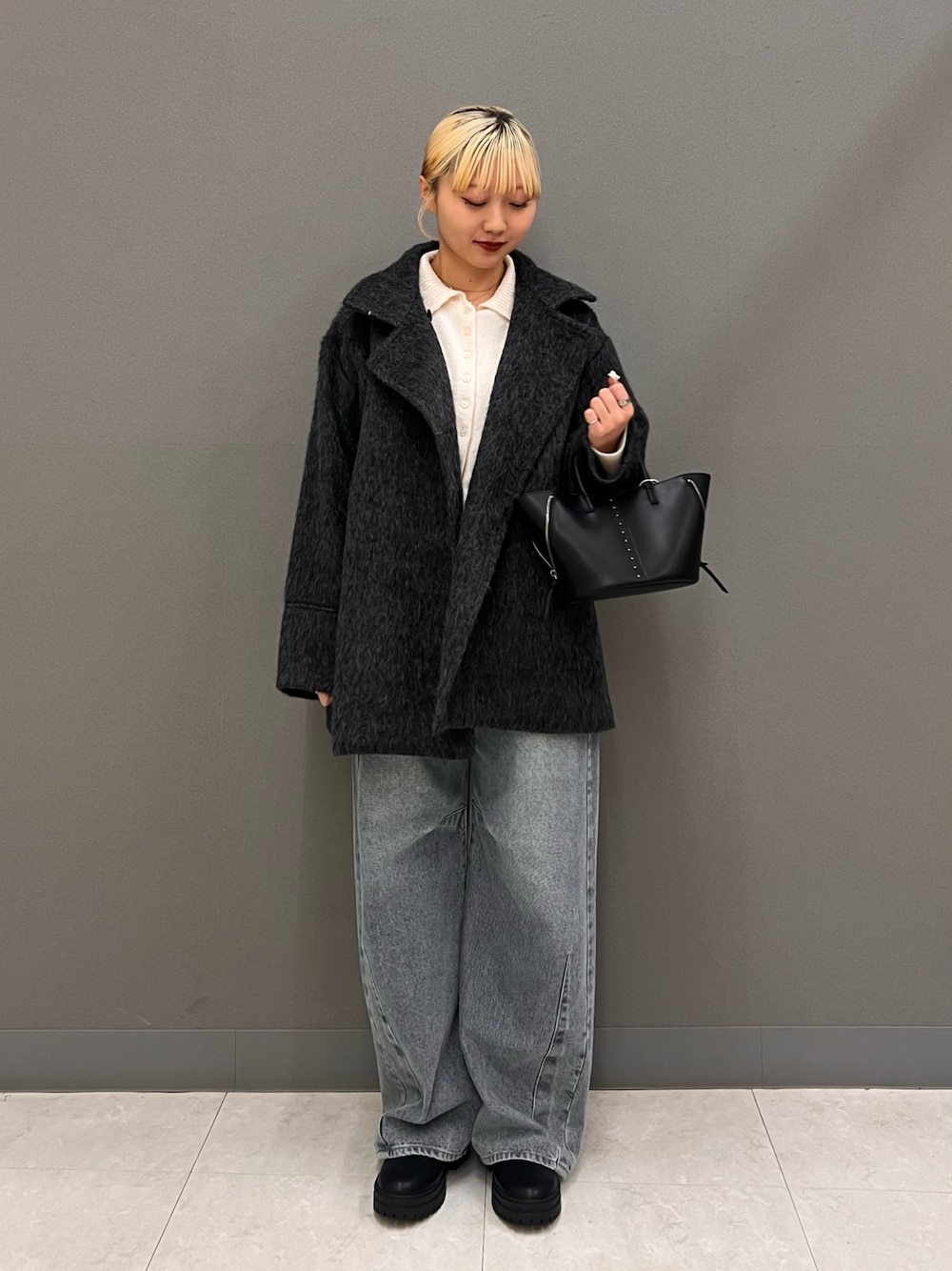 カーディガンのピンクが甘めなので、アウターとブーツはグレーとブラックを合わせて大人っぽくしました◎