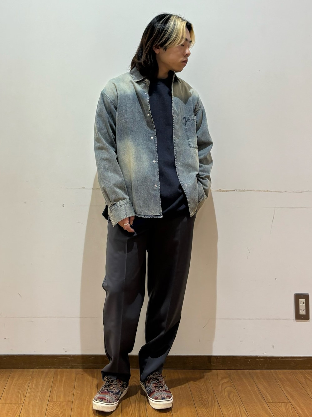 今回はダメージ加工のスウェットにシャツをレイヤードしたコーデをご紹介します。