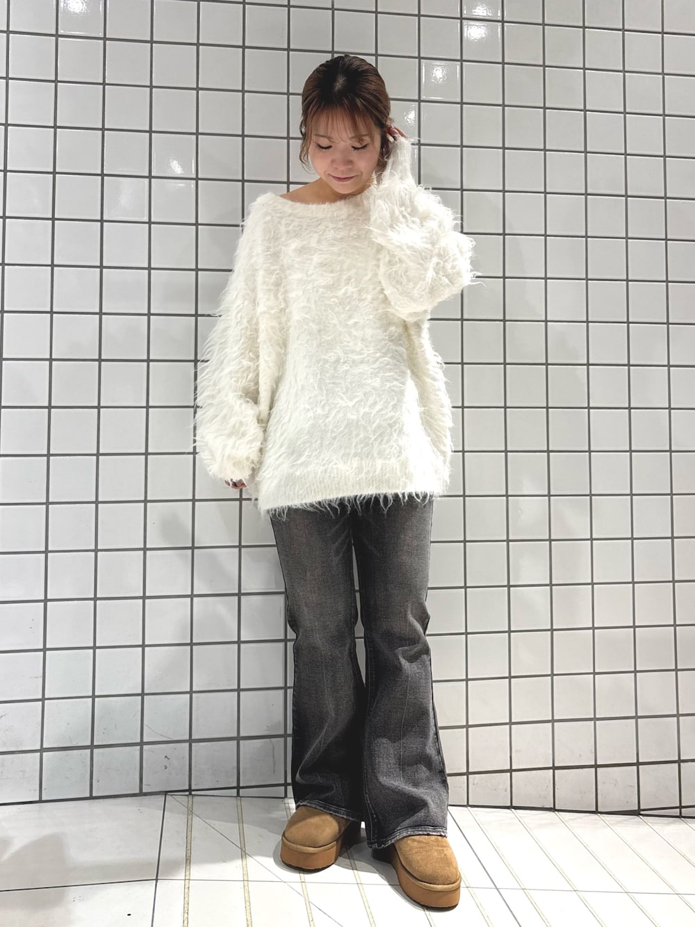 アウター脱いでもロゴニット×デニムで相性いいので心配ないです!