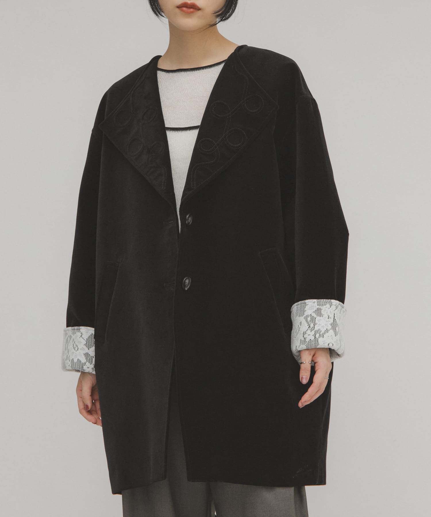 ベロア素材のジャケットは袖にレースの装飾と襟にも立体感ある装飾がおしゃれ映え💅✨