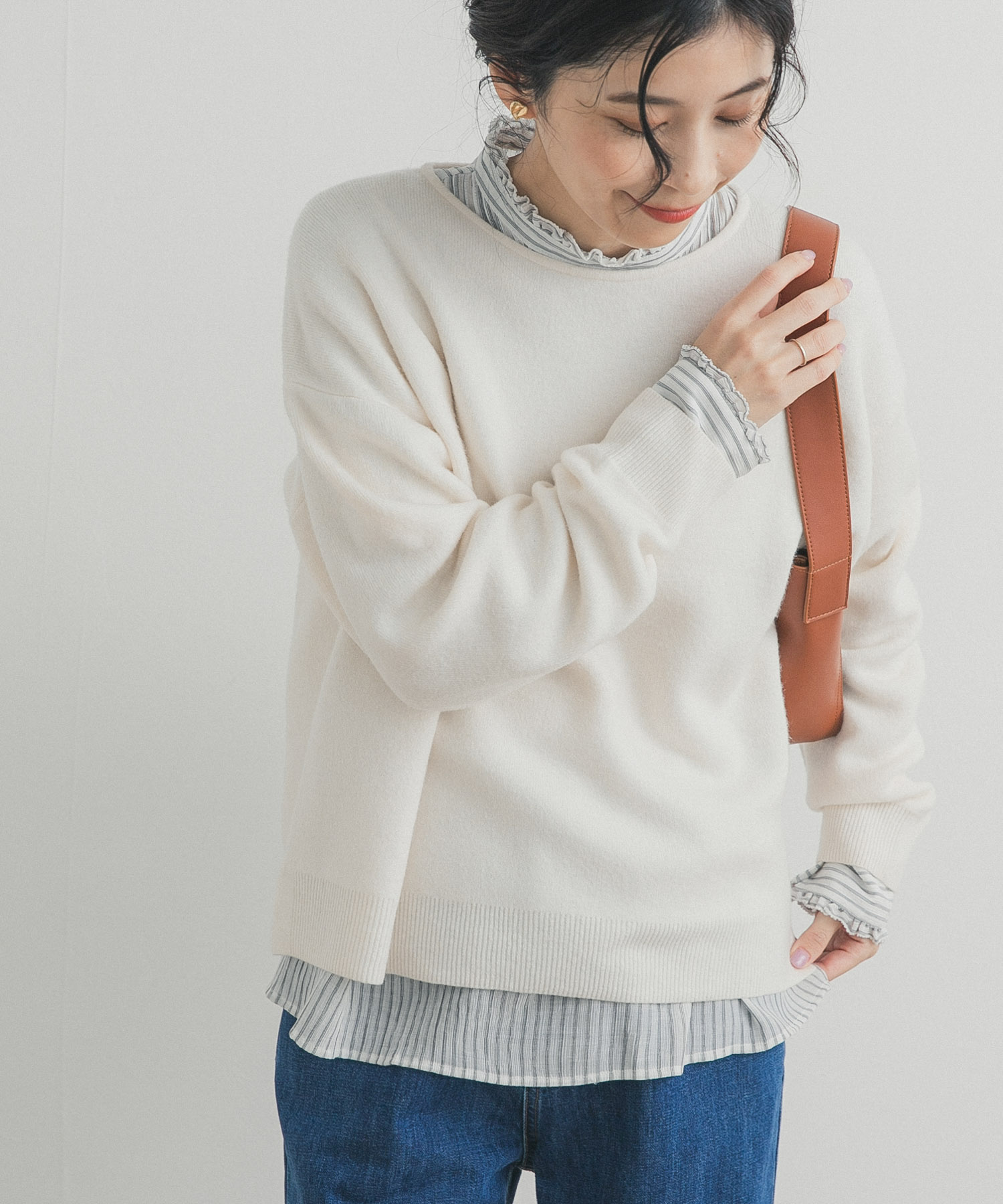 新入荷アイテムのニット着用しています。肌触りがよくほどよい厚さですよ◎首元がほどよい広がりになっているので顔まわりすっきりして見えます。