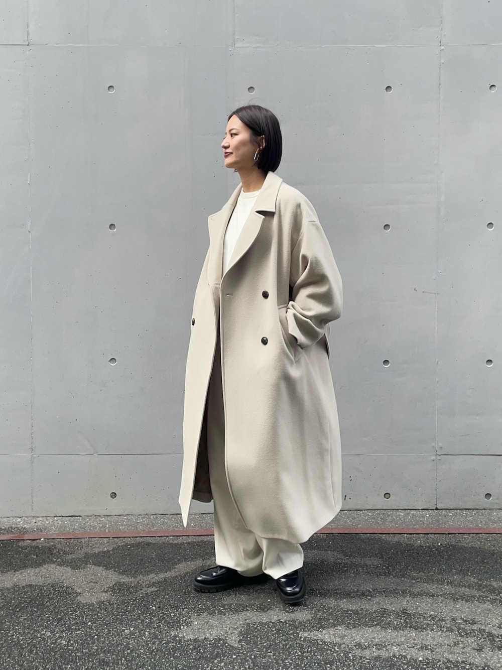 パンツはリアルバイしたタックワイドパンツで、ウエストにゴム紐がついており調節可能で楽ちんに履けるパンツです!ゆるっと感でリラックスして履けるのに、きれいめなジャケットに合わせてもお使いいただけますよ!私で8センチ裾上げしました!