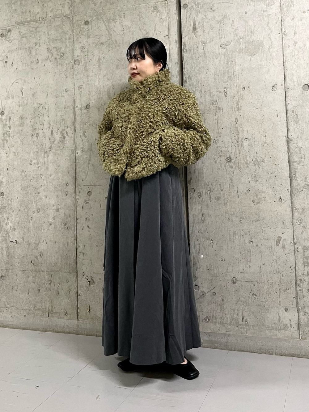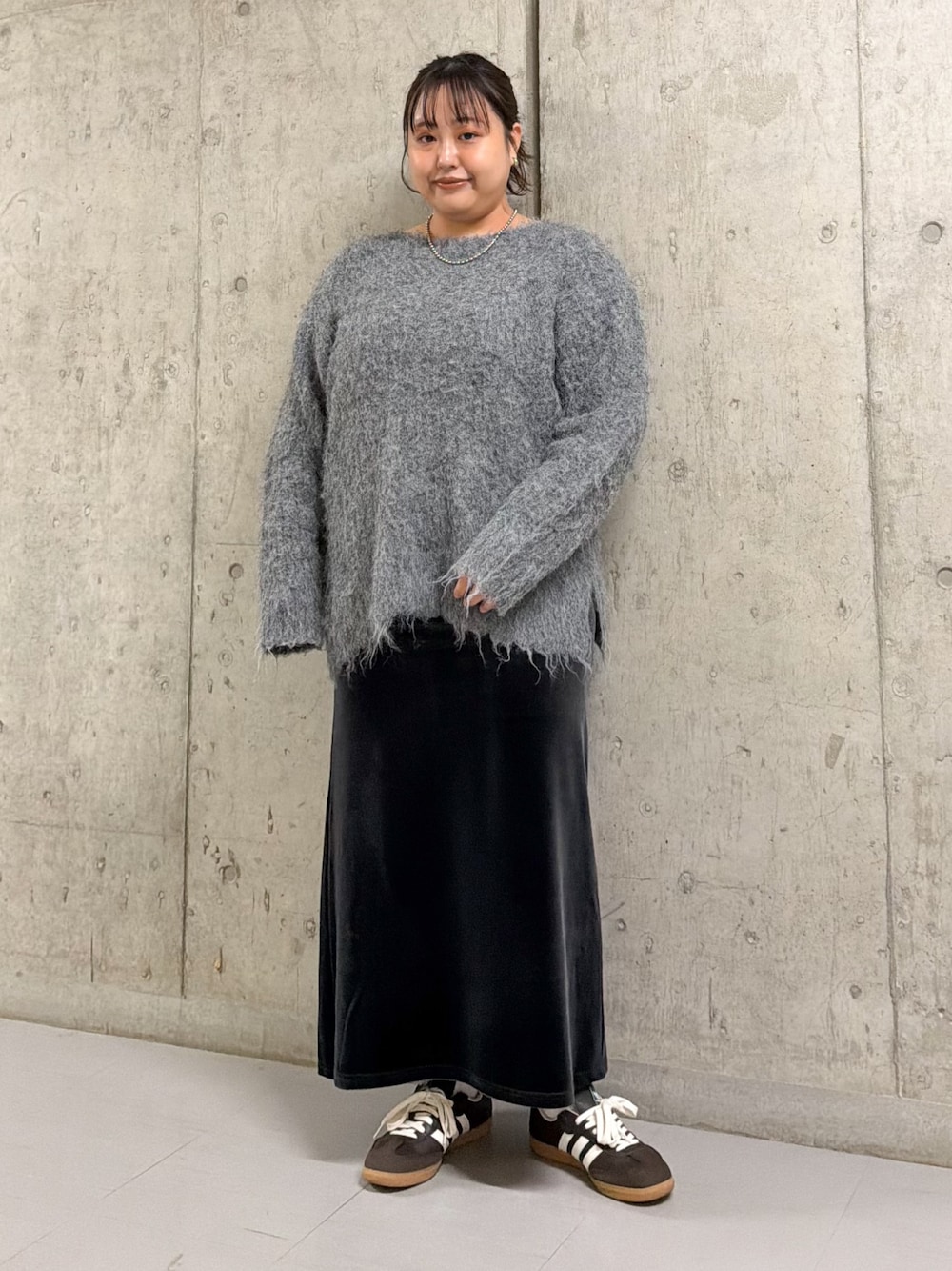 シャギールーズリブニットはゆったりとしたサイズ感なのですが、首周りがスッキリ空いているので着膨れ感なくしていただけます!