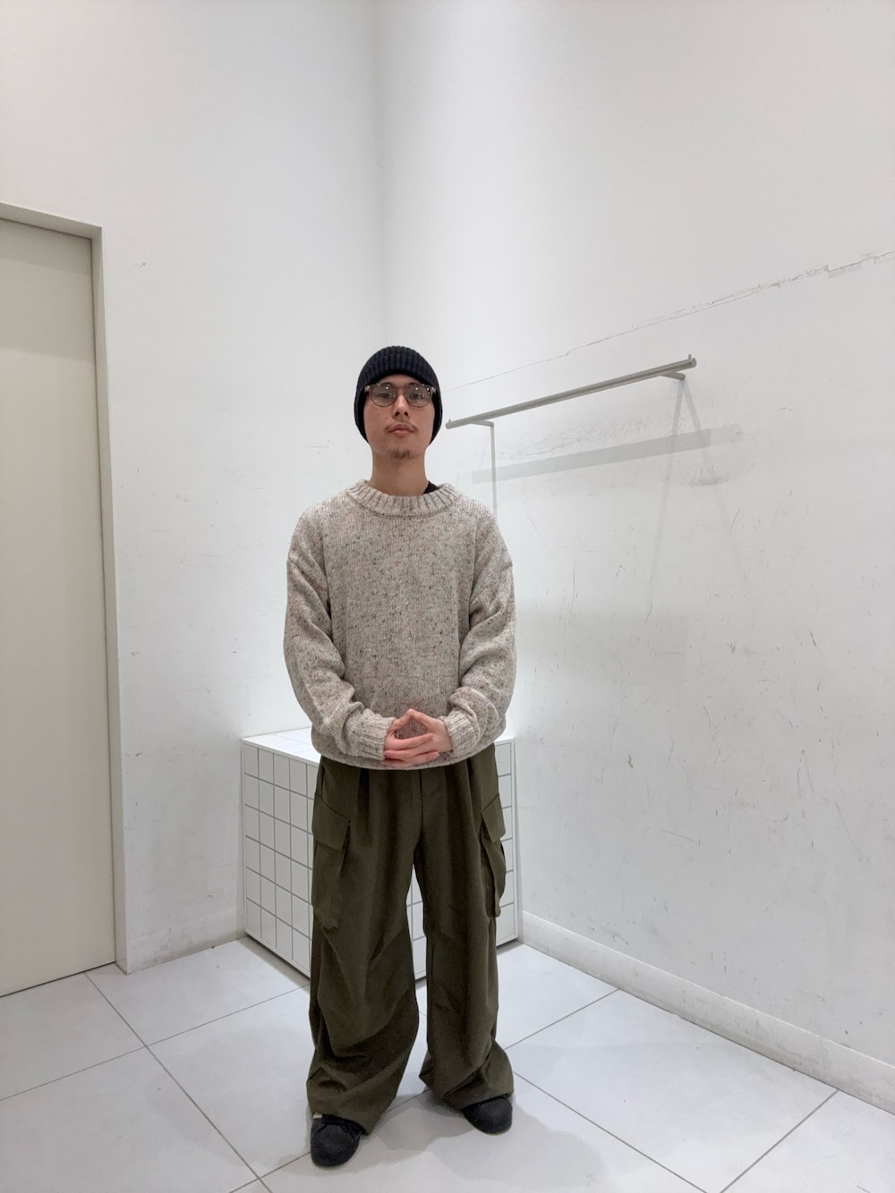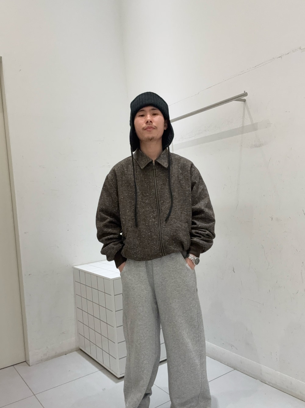 裾に入っているゴムによって丸みを帯びたシルエットを作り出し、トレンド感がある着こなしとなります。今回はワイドスラックスを合わせることでシティーボーイ感のでるスタイルにしてみました。