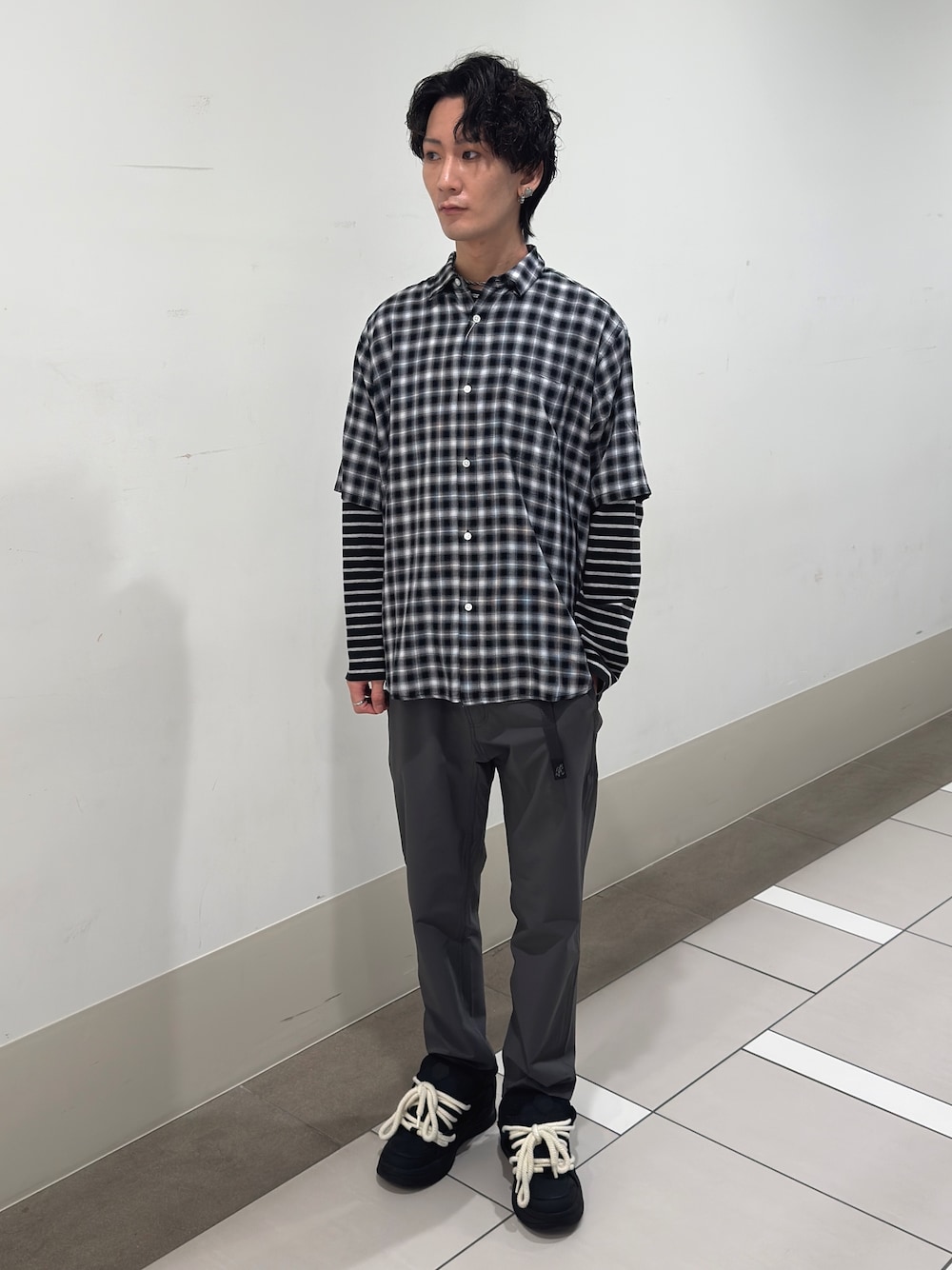 いつもご覧いただきありがとうございます。カーディガンとパンツ、スニーカーをダークトーンで統一することによって中に着たグリーンのチェックシャツを主役にしてみました!