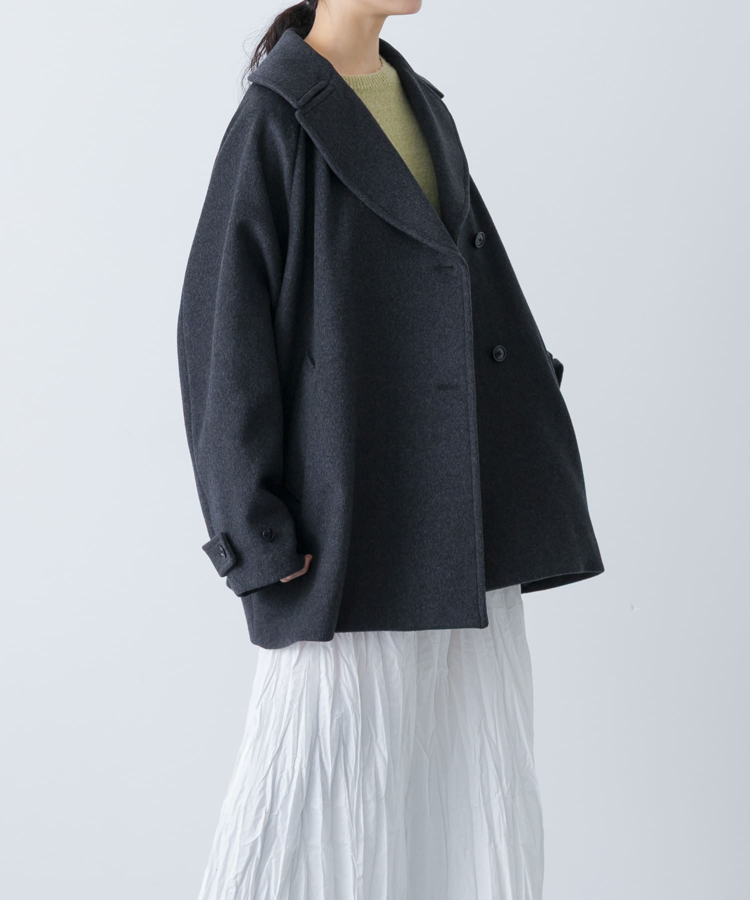 チャコールのカラーだと、よりきちんと感もありつつ大人なスタイリングに◎