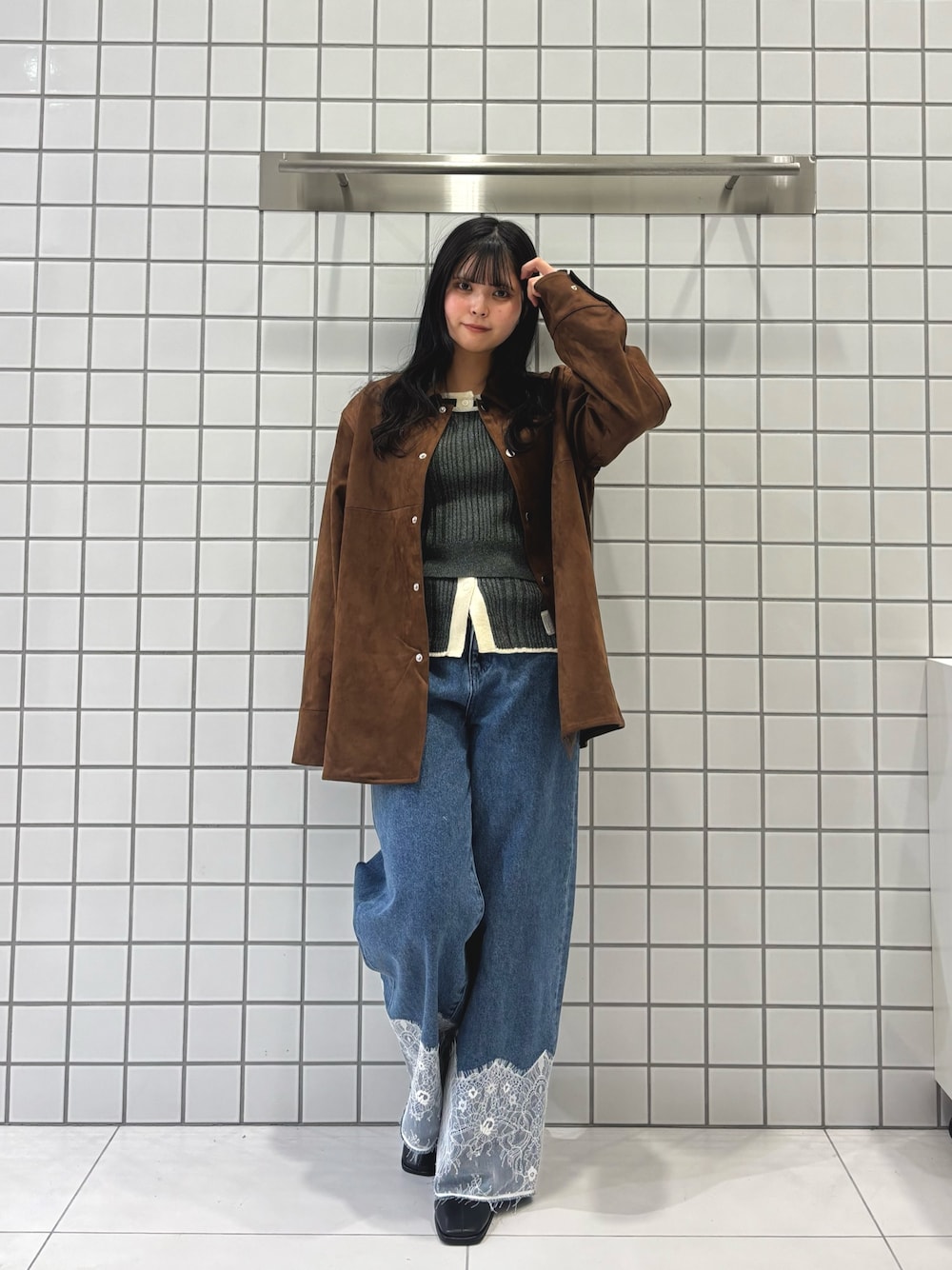 シャツ×ニットワンピのレイヤードで、こなれ感たっぷりのスタイル🖤