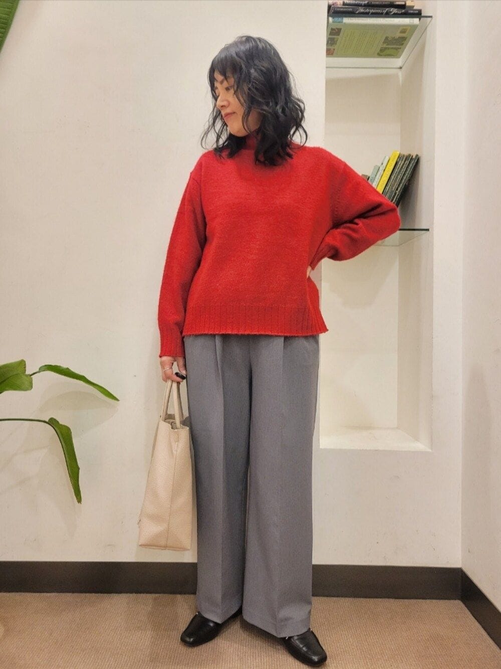 可愛いウサギ柄のヴィンテージ感のあるニットをカーブパンツとロングコートでカッコよく合わせてみました!!