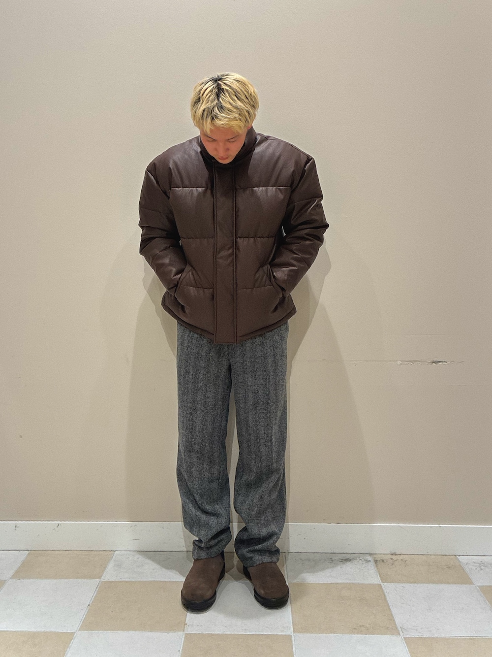 スエード調のタイトスカート、ブーツで程よくきちんと感のあるスタイルに。