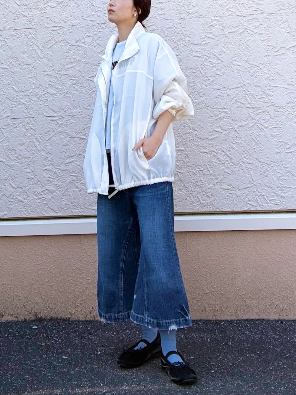 カジュアルテイストなアイテムですが、上品で落ち着きのあるTR素材を使用しているので、キレイめなスタイリングにも相性◎