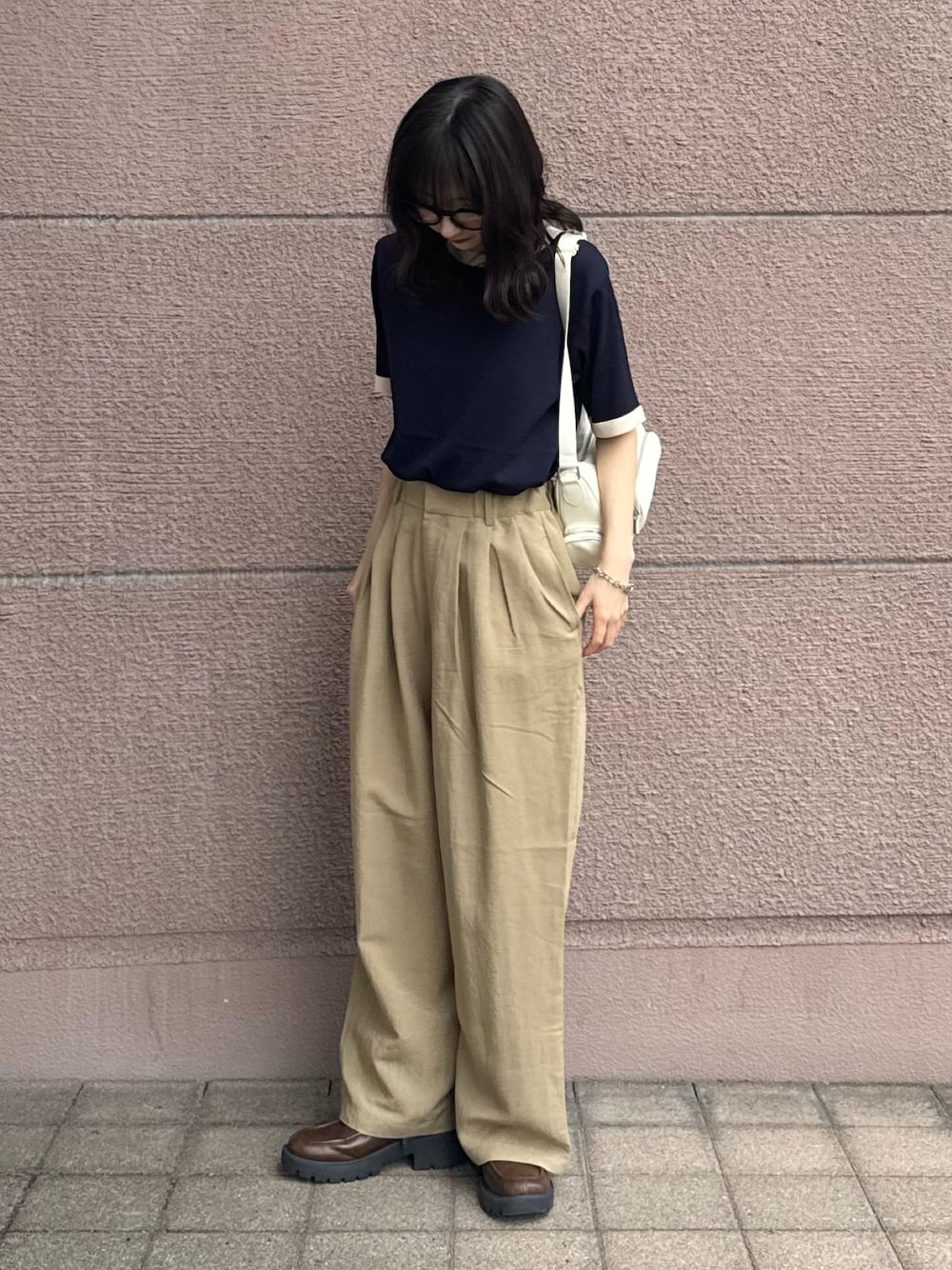 ボトムスはバレルレッグパンツでシルエットが可愛いアイテムになっています!前から見ても後ろから見ても綺麗なシルエットになっていて色味も可愛くこれからの季節にピッタリなアイテムだと思います!