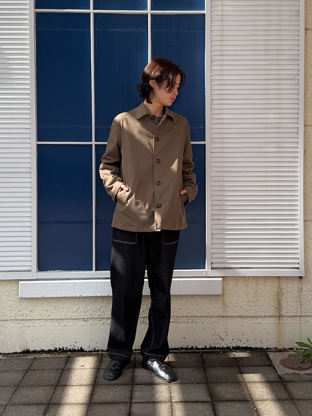 今回のコーディネートはベージュの比翼ジャケットにデニムのベイカーパンツを合わせたコーデです!比翼ジャケットはストレッチ性があって楽にカッコよく着ていただけます!ベイカーパンツはシンプルでデニム生地です!